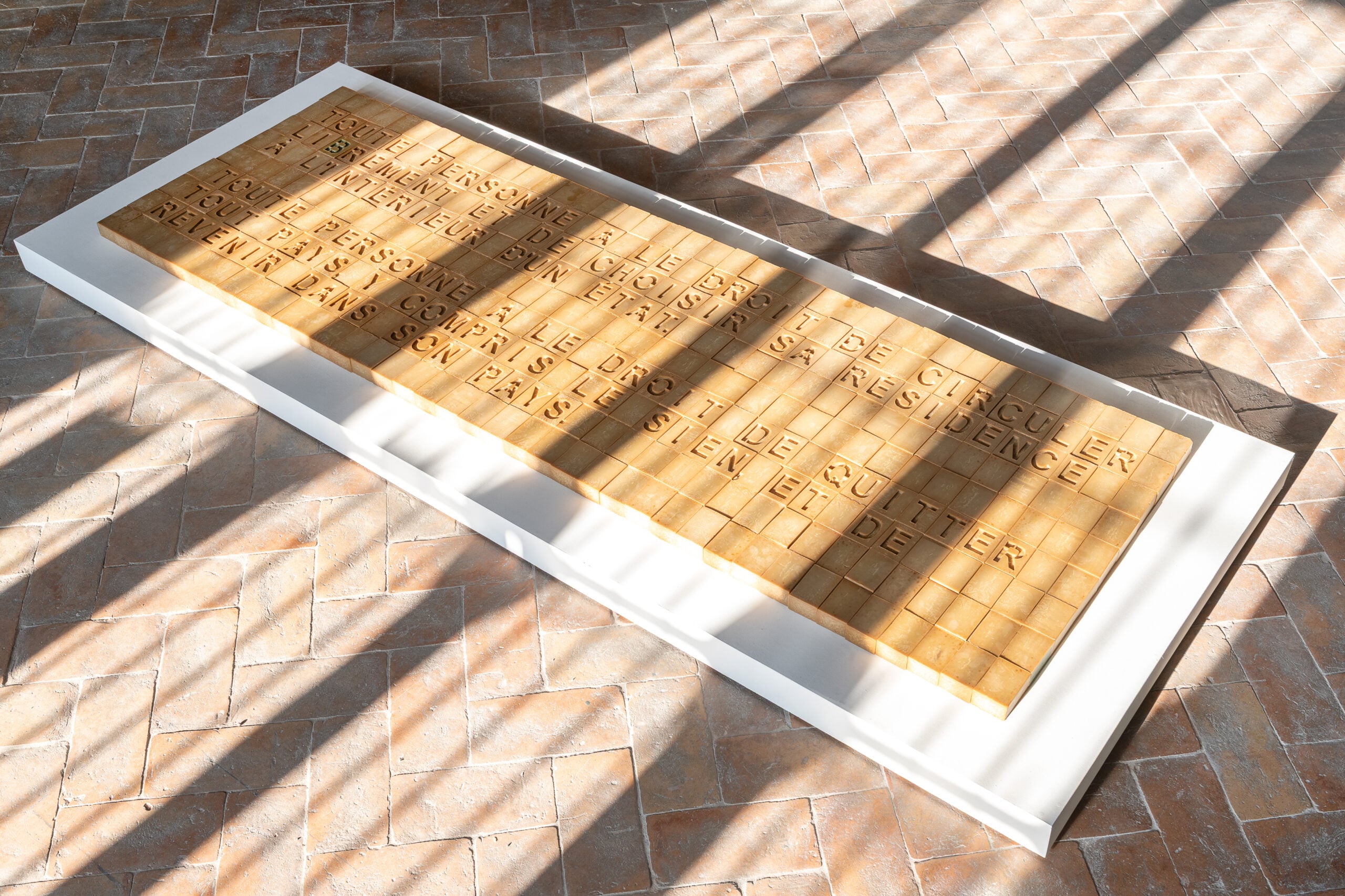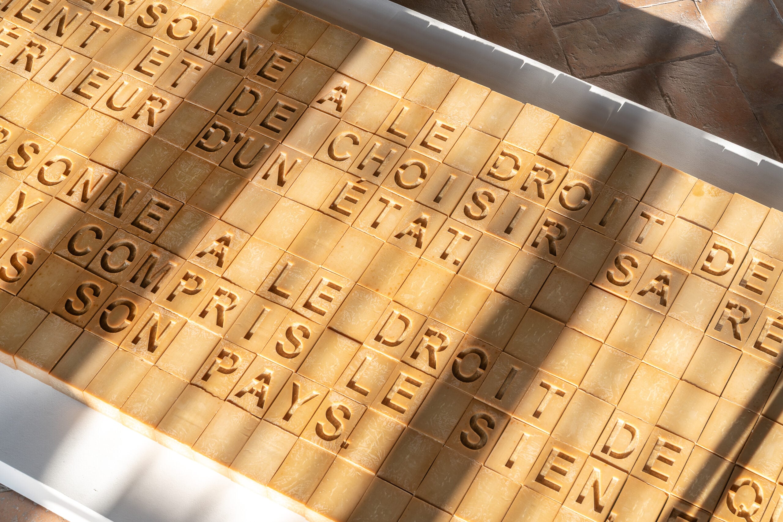 All’ingresso della mostra, ad esempio, è ospitata l’opera Non di solo pane vive l’uomo, composizione su cui si leggono le parole dell’articolo 13 della Dichiarazione universale dei diritti umani: “Ogni uomo ha il diritto di scegliere il luogo in cui vivere”. Una frase che sembra scolpita sul marmo e che invece l’artista palestinese ha inciso su più di 350 saponette di Marsiglia, un oggetto destinato, per sua natura, a degradarsi e a sciogliersi, soprattutto se “qualcuno”dice Batniji “decide di lavarsene le mani”.