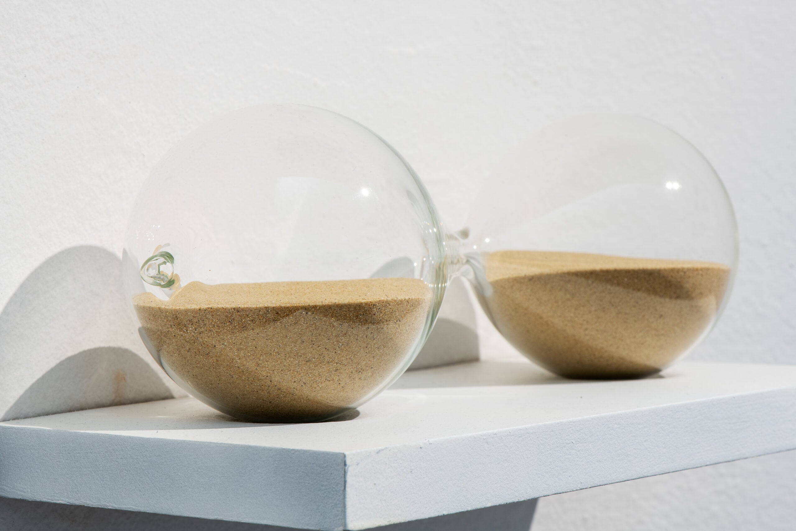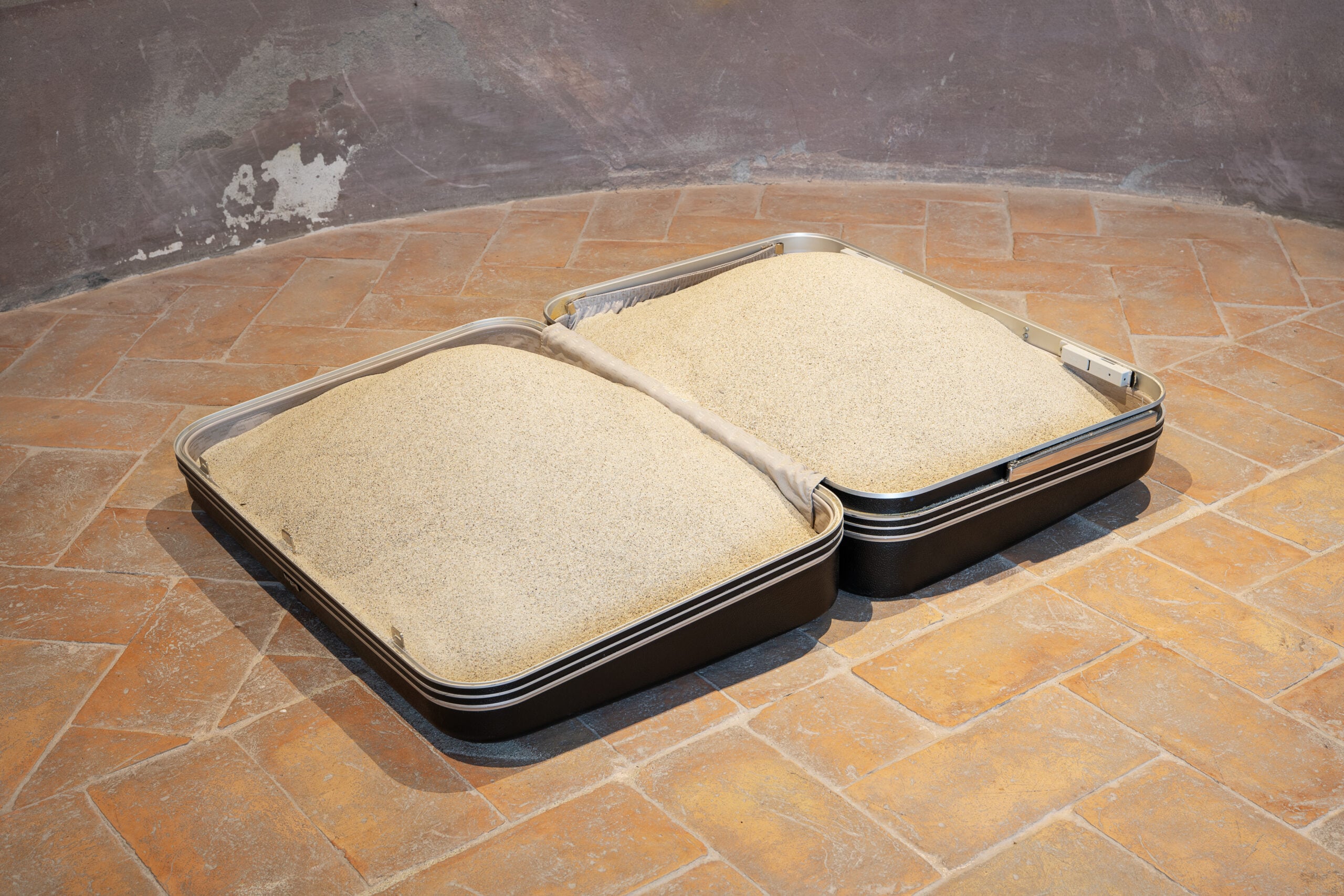 Esposte a Modena c’è anche un mazzo di chiavi in vetro. Su una mensola c’è una clessidra adagiata dove la sabbia non scorre più, è immobile a rappresentare il tempo cristallizzato in una fragile attesa. Oppure una valigia piena di sabbia dove è di nuovo il tema dell’esilio a prendere forma.