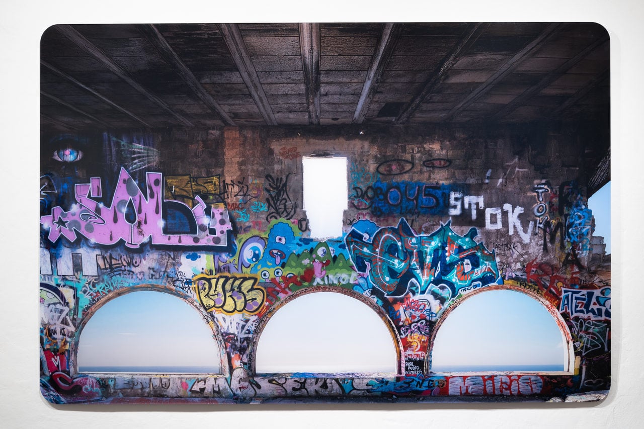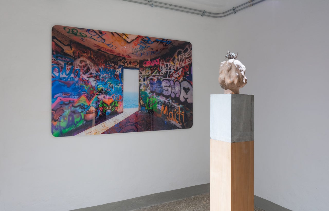 È la mostra stessa ad essere un’opera: l’intero percorso è infatti di ascensione laica, di emersione dal buio in tre stazioni. Non è un caso, infatti, che al primo piano (l’ultimo in altezza) sia proprio la luce la guida delle due sale che vi si rispecchiano. In quella più luminosa una enigmatica e composita scultura di Consani del 2021 (Messaggi rivoluzionari) guarda la stampa di Ozzola Amarti mi affatica, dove il chiarore, quasi allo zenit, è dato dallo sfondamento di tre archi sul mare. Mentre nella stanza adiacente, in una dimensione metropolitana analoga, fatta di graffiti e cose terrene, c’è una porta che si affaccia sull’orizzonte offrendo l’unica fuga di luce, mentre Autoritratto – il giovane Barry Lindon (Consani, 2026) guarda cieco una dimensione che non è reale ma in continuum tra vita e morte.