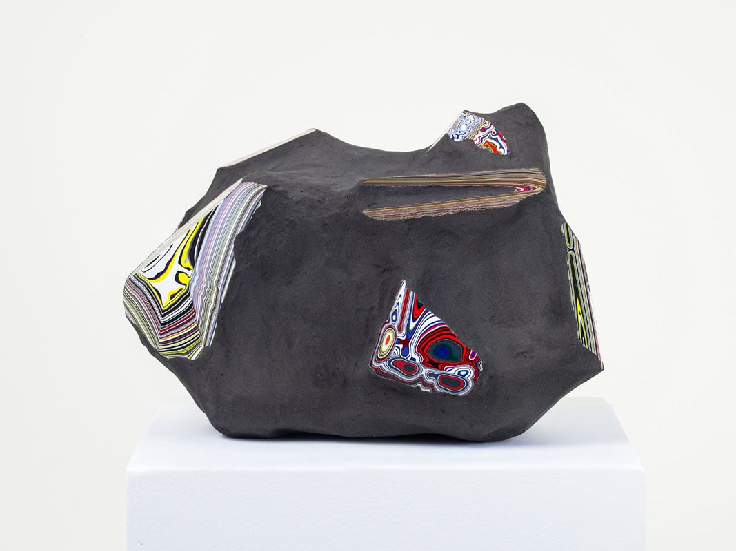 Lo studio mineralogico si espande nelle due sculture della serie Post-Fordite. La Fordite o Agata di Detroit è l’elemento industriale recuperato dalle ex fabbriche, tagliato e lavorato, fino ad essere messo sul mercato come gemma. L’assemblamento di questa formazione genera delle rocce ibride, testimoni del lavoro storico umano, e aperto ad accogliere le possibili tracce del mondo capitalista post-fordista.