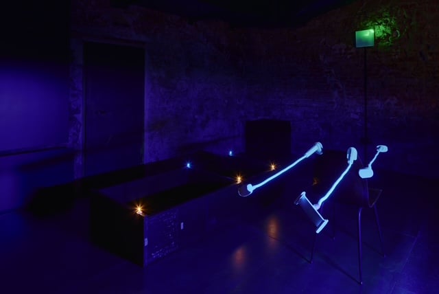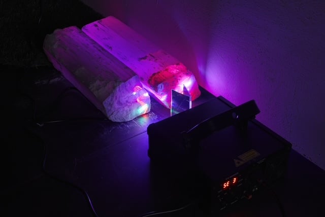 L’installazione hello walls demo chiude il percorso della mostra accostando un proiettore di laser colorati a due grandi cristalli di selenite – un materiale di colore bianco, che veniva utilizzato nella cerchia muraria tardoantica di Bologna. Le due rocce, comportandosi come fibre ottiche, diffondono la luce verso il vertice di un triangolo realizzato con prato artificiale, creando così un effetto visivo in continuo mutamento. La sala, che si è scelto di lasciare quasi del tutto libera da oggetti, mostra così le caratteristiche architettoniche dello spazio. “Si può dire che la sua opera consista di due metà, commenta Simone Menegoi – che è stato anche co-curatore della mostra dedicata a Smith alla Triennale di Milano nel 2014 – “La prima è costituita dalle opere vere e proprie; la seconda, dal modo in cui quelle opere vengono collocate nello spazio espositivo, spesso insolito e spiazzante, e dal modo in cui lo spazio viene modificato dall’artista in rapporto alle opere; alterando l’illuminazione standard, mettendo in luce elementi tecnici che di solito rimangono nascosti, eccetera. È affascinante vedere questo approccio in un luogo così carico di storia come i sotterranei di Palazzo Bentivoglio”.