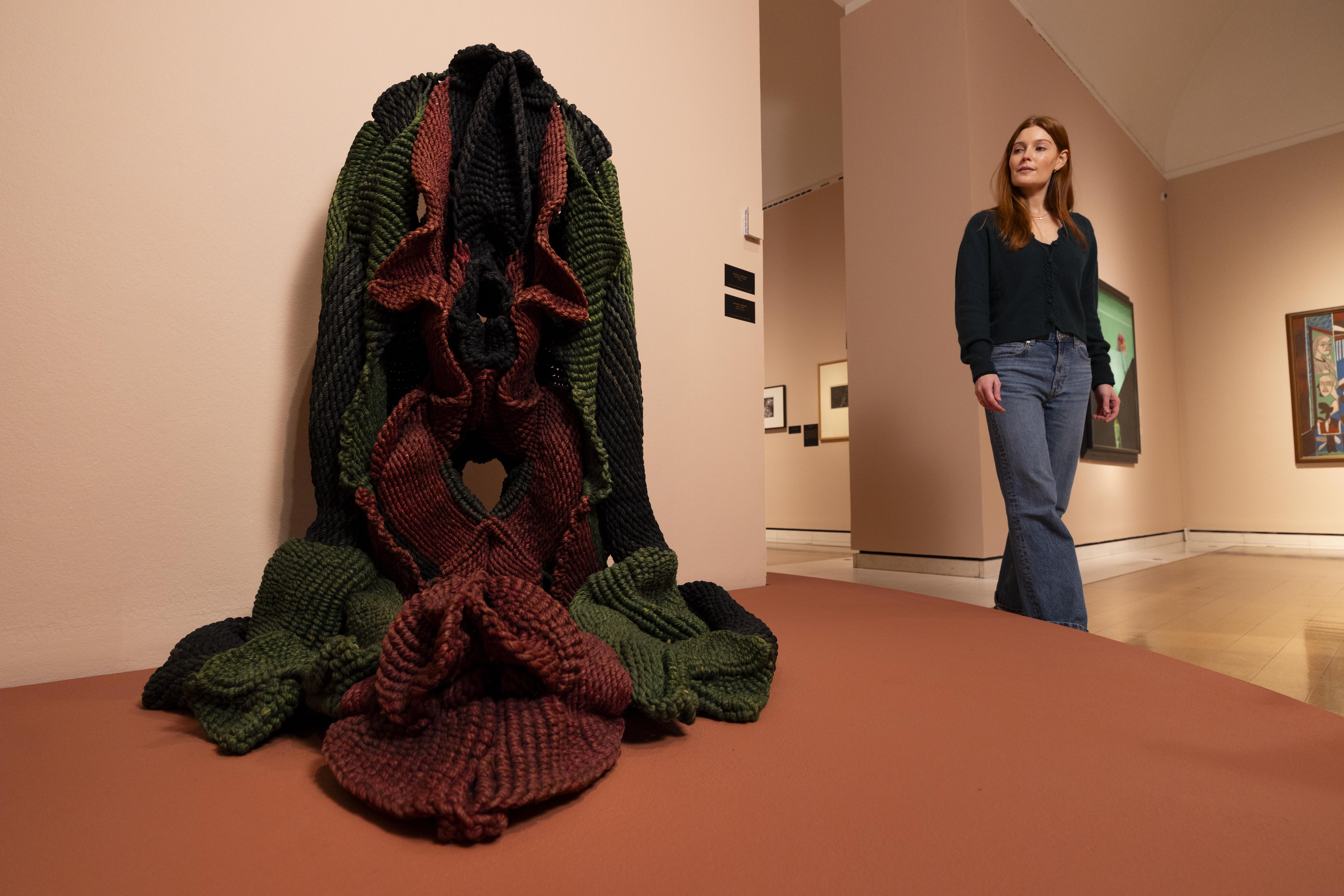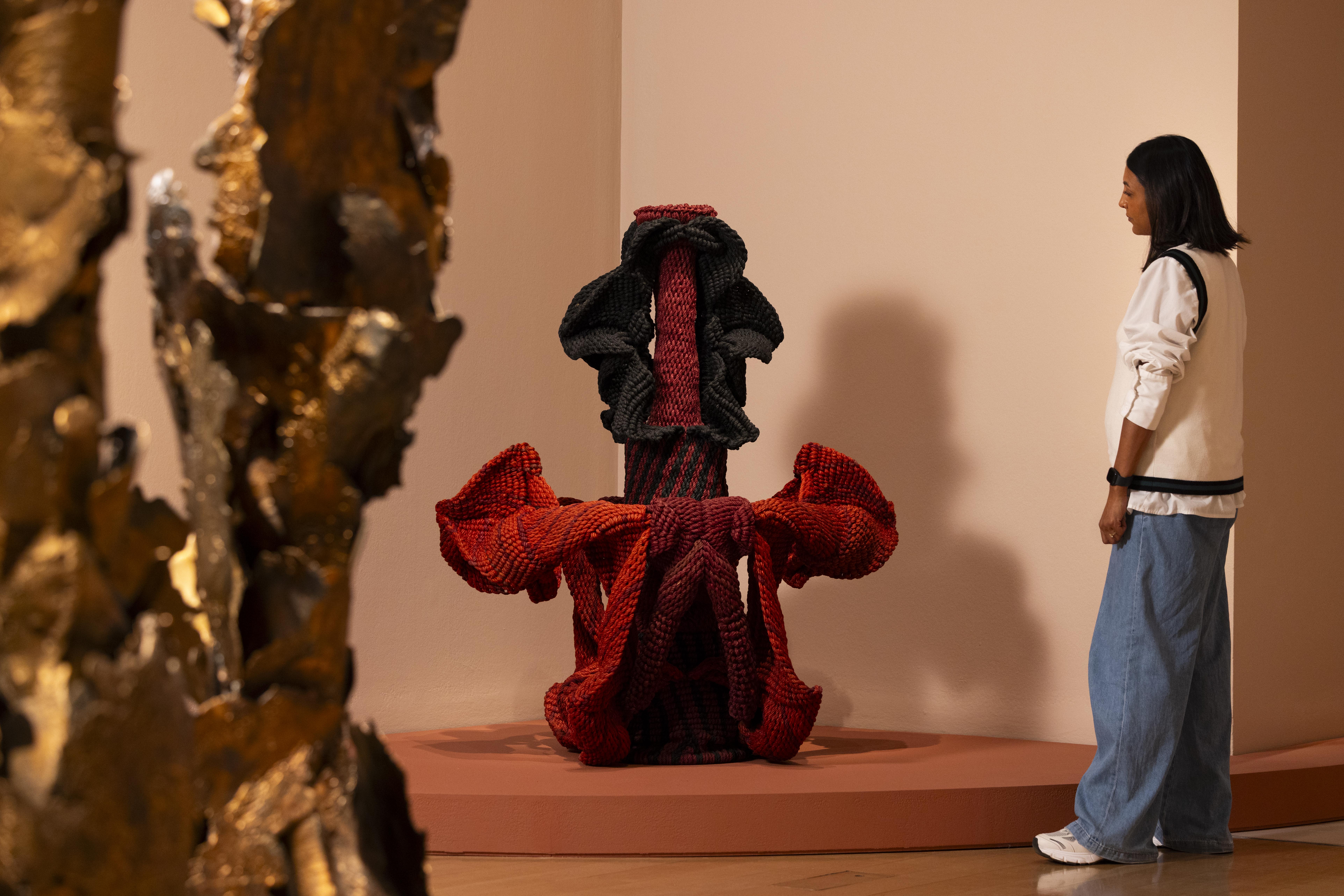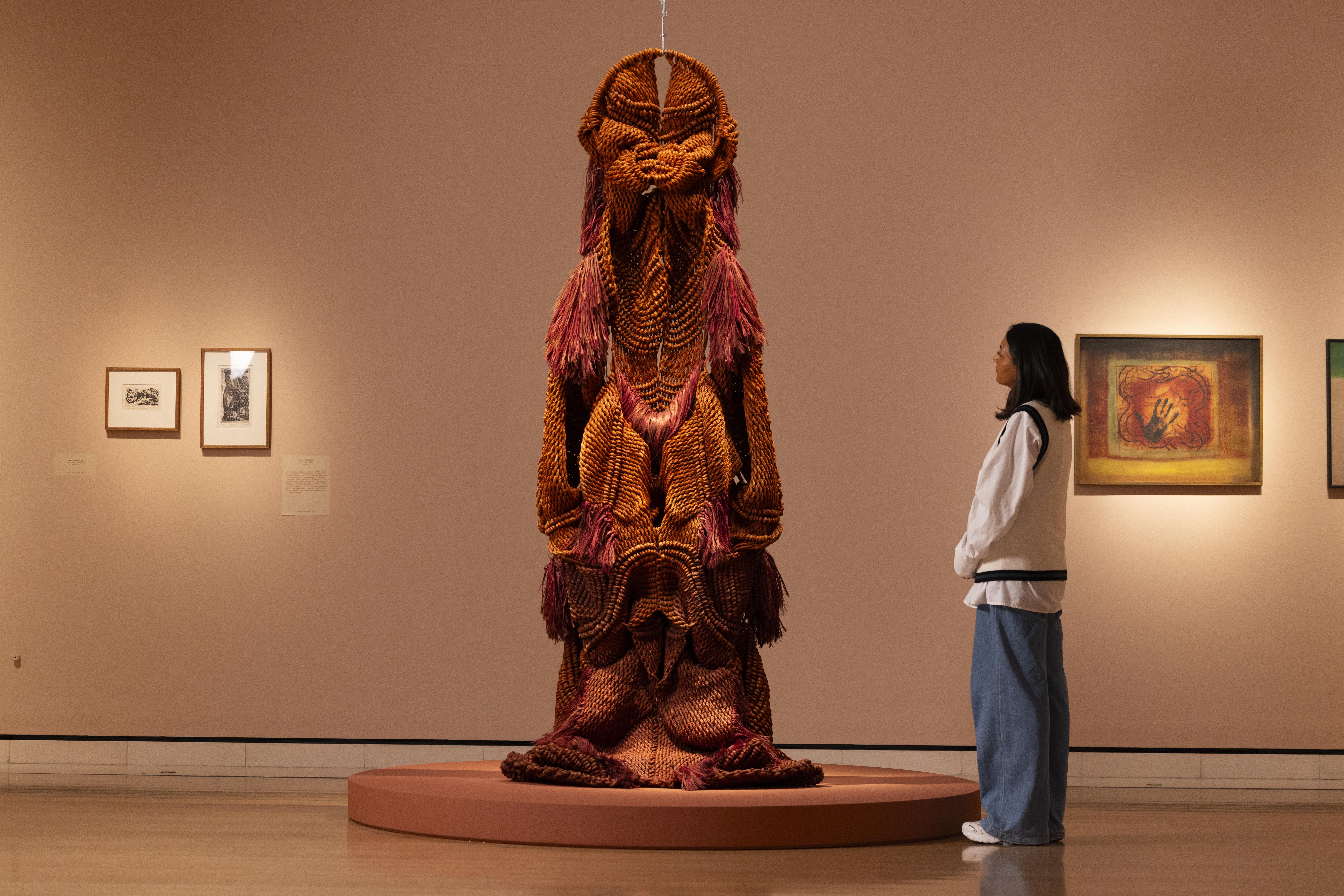 La fibra di canapa tinta e intrecciata, il peso, la gravità delle forme producono una sorta di ritualità. La spiritualità è presente senza simboli religiosi espliciti e il visitatore deve sovvertire l’abitudine dell’arte occidentale di avere risposte visive dirette. Ci si pone domande sul corpo, sulla materia, sulla natura e si vaga rassicurati tra le sculture monumentali dell’artista che fondono astrazione, natura, anatomia e tradizione, rendendole presenze più che oggetti. Sospese o adagiate nello spazio, aggrovigliate o sedute, hanno un aspetto ambiguo e non sono mai del tutto riconoscibili: evocano corpi, piante, radici, talvolta elementi sessuali, senza fissarsi in un’immagine definitiva. Un’incertezza che rallenta lo sguardo.