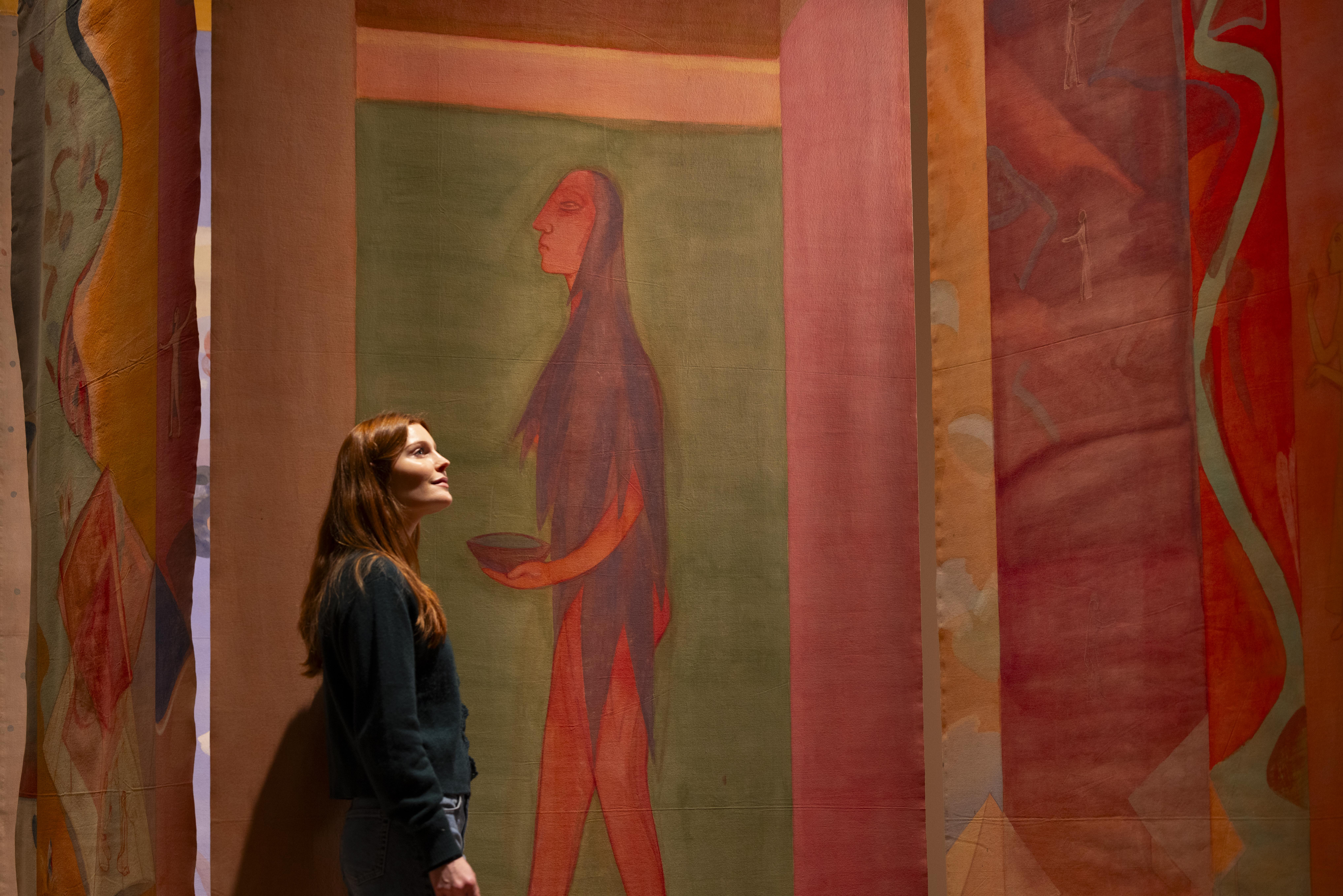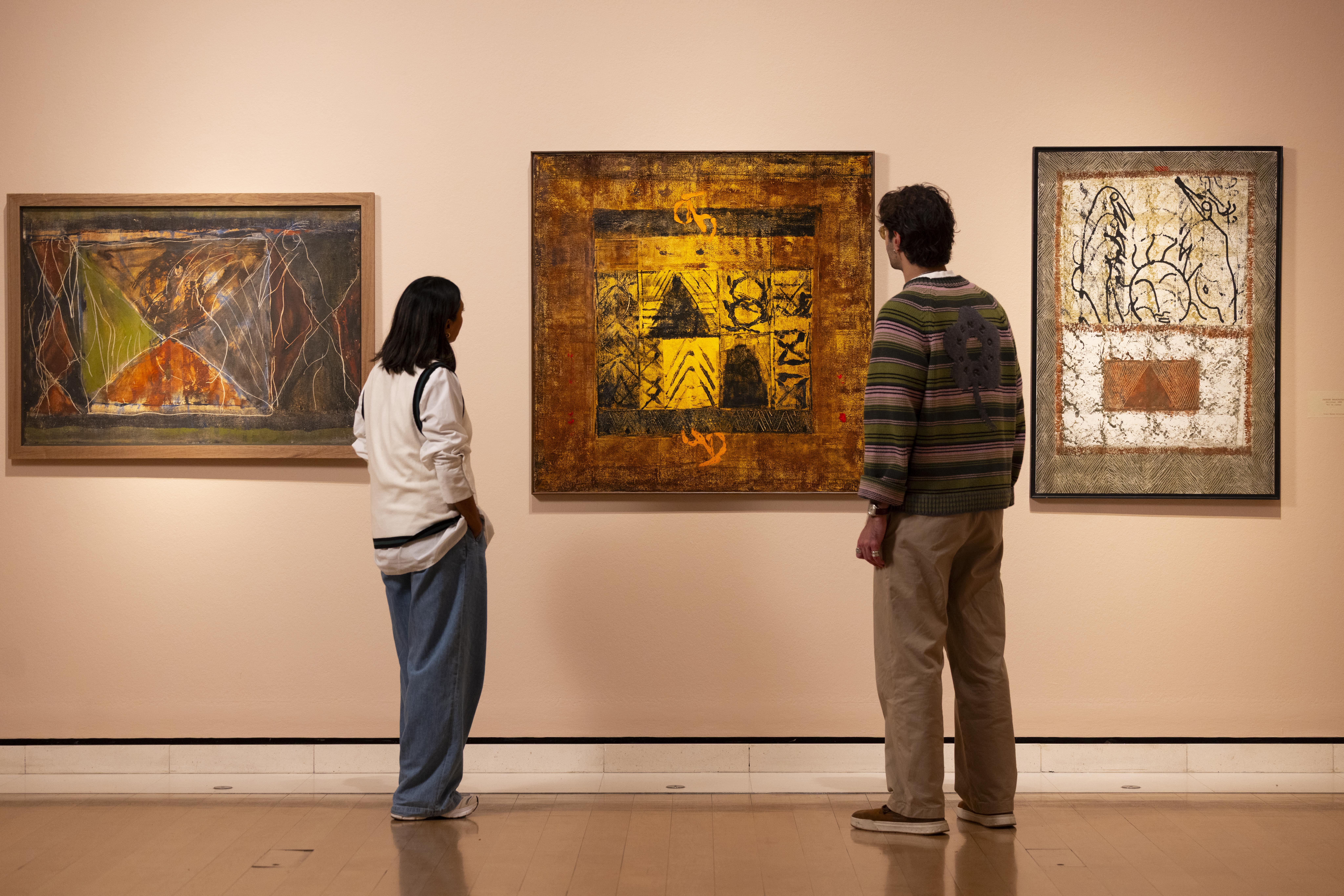 Quella della mostra londinese è una narrazione particolarmente significativa perché non isola Mukherjee, ma la mette in dialogo con gli artisti del suo “cerchio”, con la loro autonomia linguistica e concettuale e offre un’idea di arte fatta di relazioni, insegnamenti e continuità culturali che hanno fatto rete. I suoi mentori e compagni d’arte sono Leela Mmukherjee e Benode Behari Mukherjeee, genitori dell’artista e figure significative nel mondo dell’arte indiana del XX Secolo, entrambi docenti di arte alla Scuola di Kala BHavana a Santiniketan; KG Subramanyan, influente educatore e artista che ha incoraggiato esplorazioni materiali e l’incontro tra arte e artigianato; Jagdish Swaminathan, amico e mentore dell’artista, con opere che affrontano iconografia indigena e critica socio politica; Milita Sheikh e Gullammohammed Sheikh, artisti contemporanei con opere significative di pittura e stampa.