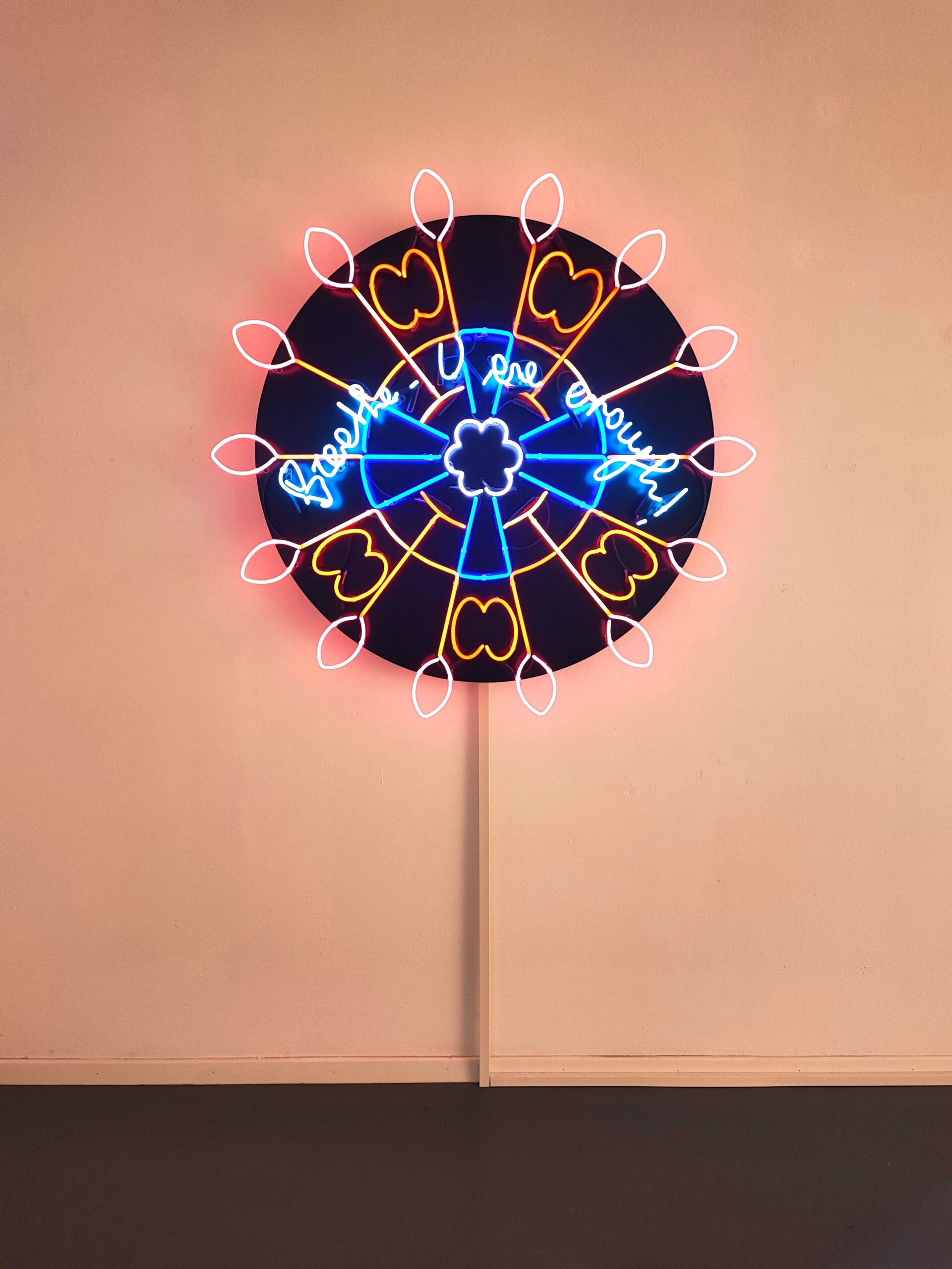Il percorso espositivo va ad occupare tutti e tre i piani del museo con opere realizzate tra il 2019 e il 2025 e si apre con Alliance des corps, 2021 una luminaria dal messaggio inequivocabile, posta nell’atrio del museo che sembra invitare i passanti ad entrare, proprio come accade nelle feste di paese notoriamente diffuse nel sud dell’Italia dove le luminarie diventano scenografia condivisa di un sentimento identitario forte e radicato.