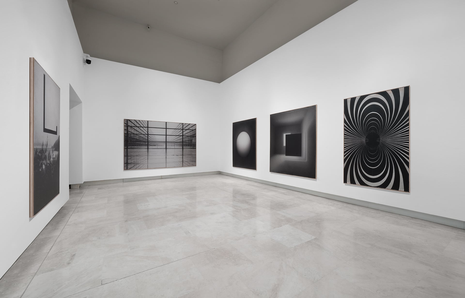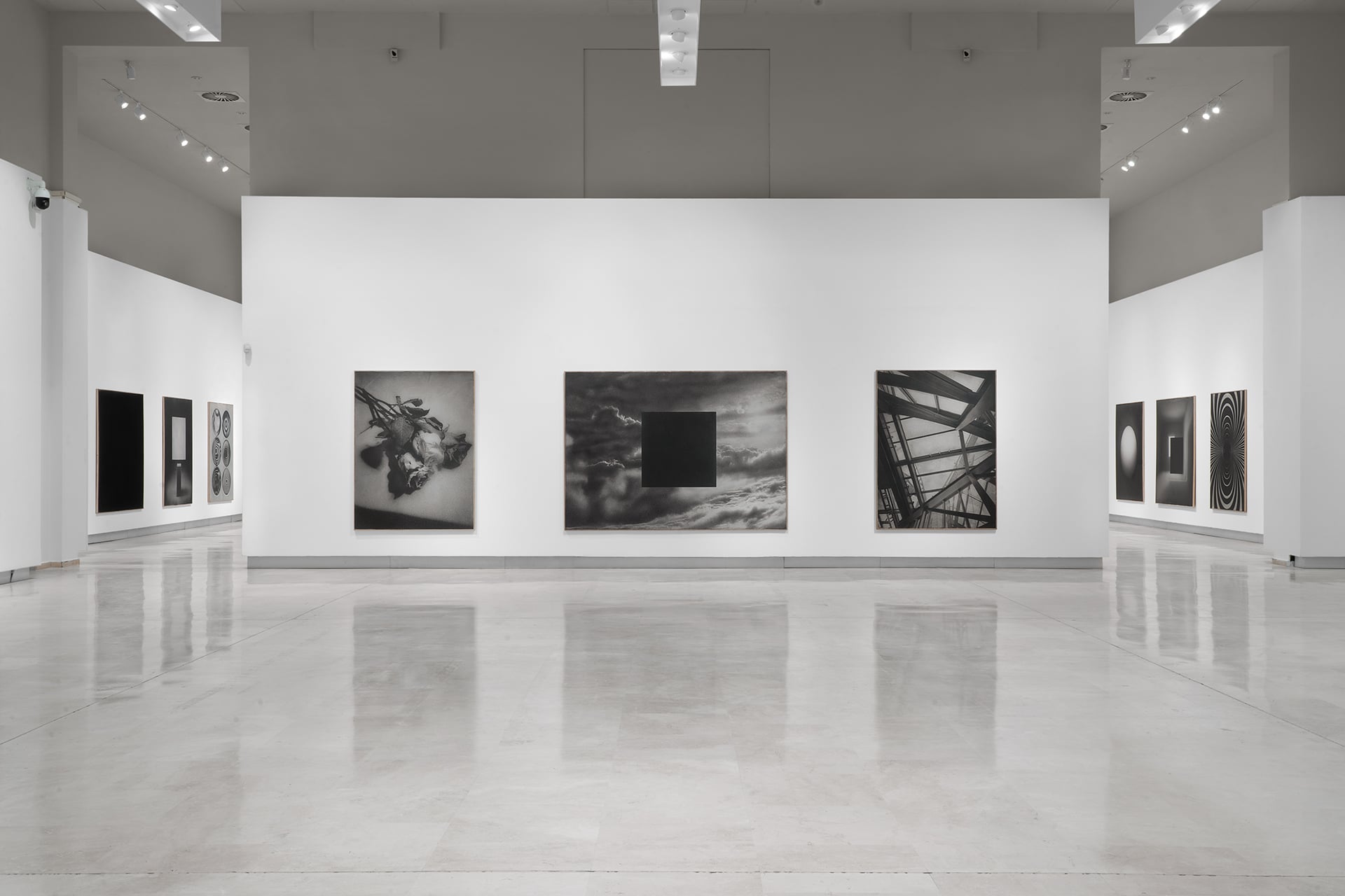 “Associo le immagini alle ombre”, dice lo stesso Tirelli, “proiettare il proprio sguardo nell’abisso del buio assoluto, significa tuffarsi nell’infinito”. Quel buio è il Senza Titolo n. 17, solo un quadrato nero profondo. L’artista si racconta alla finestra della sua casa nelle montagne di Spoleto: “mi affacciavo e, a mio occhio, c’era un nulla che conteneva il tutto possibile, perché tutto era lì, ma indistinto, senza soluzione di continuità, fluido”. E quel buio è ancora nel quadrato nero che si staglia sul cielo dei Senza Titolo n. 13 e n. 26 e nella sconcertante geometria immaginaria del Senza Titolo n. 7, dove lo spettatore è invitato a varcare la soglia pittorica e a perdersi in un labirinto ottico ipnotico.