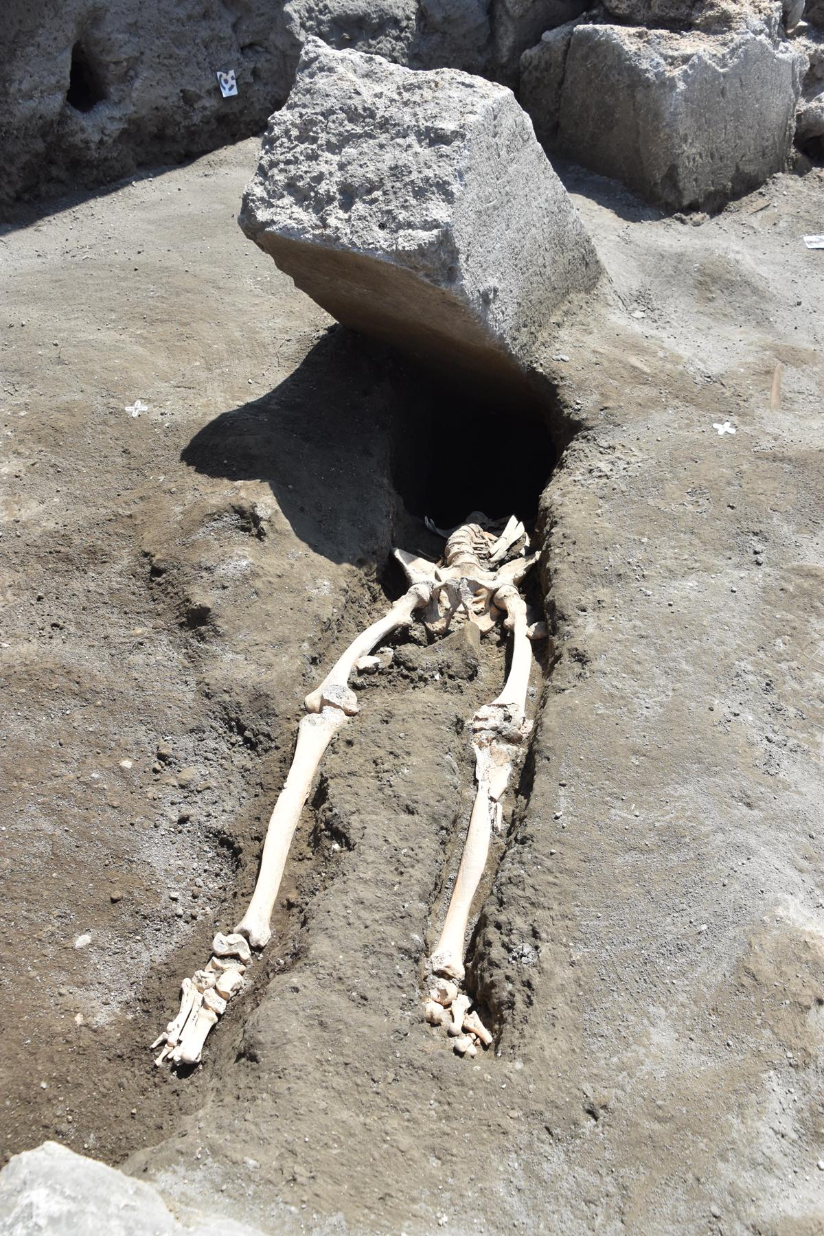 Ed è stata trovata esattamente così, con il corpo sbalzato all’indietro dal potente flusso piroclastico e il torace schiacciato dal grosso blocco di pietra che lo ha ucciso, probabilmente in un tentativo disperato di fuga dalla furia eruttiva, la prima vittima del cantiere dei nuovi scavi della Regio V di Pompei. Dalle prime analisi condotte da un’antropologa è emerso che si tratta di un uomo di circa 35 anni, alto circa 1,70, claudicante. La presenza di lesioni alle tibie indicano un’infezione ossea, che potrebbe essere stata la causa di significative difficoltà nella deambulazione, tali da impedire all’uomo di fuggire. Proprio questo difetto fisico ha presumibilmente compromesso le possibilità di salvezza dell’uomo, morto sul colpo, dopo essere stato colpito da un masso di oltre 300 chili, mentre tentava di scappare. “Lo scheletro è stato ritrovato”, si legge nel comunicato stampa emesso dal MiBACT, “all’incrocio tra il Vicolo delle Nozze d’Argento e il Vicolo dei Balconi, di recente scoperta, che protende verso via di Nola. Dalle prime osservazioni, risulta che l’individuo sopravvissuto alle prime fasi dell’eruzione vulcanica, si sia avventurato in cerca di salvezza lungo il vicolo ormai invaso dalla spessa coltre di lapilli. Il corpo è stato infatti rinvenuto all’altezza del primo piano dell’edificio adiacente, ovvero al di sopra dello strato di lapilli. Qui è stato investito dalla fitta e densa nube piroclastica che lo ha sbalzato all’indietro”.