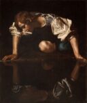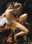 Nel percorso espositivo c’è subito Caravaggio a trasferirci l’emozione di Narciso (1600 circa), che guarda affascinato la figura di un volto giovanile riflessa sull’acqua di uno stagno, quando ancora ignora che sta ammirando la propria immagine. Con la marmorea testa di Medusa (1638-40), anche Bernini si concentra sul potere dello sguardo e lo fa con un raffinato gioco che si presta a doppi sensi. Lei, la Gorgone dai capelli di serpente, bellissima e mostruosa insieme, pietrifica tutti coloro che osano guardarla. L’artista però non attinge direttamente dal mito, ma scolpisce il volto angosciato di Medusa mentre si guarda allo specchio, traendo l’episodio da una poesia di Giovan Battista Marino. Da notare come in entrambe le opere il senso è costruito sull’immagine riflessa, il che, con tutta evidenza cronologica, lascia ipotizzare una certa fascinazione di Bernini per l’opera di Caravaggio. Cosa non del tutto inedita, giacché il giovane Gian Lorenzo, all’epoca della sua collaborazione all’opera Priapo e Flora di Villa Borghese con il padre Pietro, artista e scultore anch’egli, nel realizzare “la cesta di frutta” si ispirò al modello naturalista caravaggesco. Ovviamente entrambi sono presenti in mostra con i rispettivi autoritratti. E per Caravaggio, quale opera può focalizzare con estrema crudeltà la sua travagliatissima vita, se non nel mostrare orribilmente il volto di se stesso senza più il corpo, nel dipinto David con la testa di Golia?