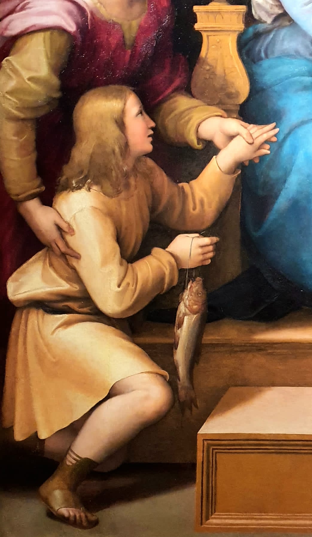 Spicca, poi, e varrebbe da sola il viaggio, la celebre Madonna del pesce di Raffaello. Proveniente dal Prado di Madrid, presenta, da un lato, San Raffaele Arcangelo e il piccolo Tobia con il pesce, che fa riferimento alle interiora servite per guarire il padre dalla cecità; dall’altro, San Girolamo con la Bibbia e il leone. Fu commissionata per la chiesa napoletana di San Domenico Maggiore ed eseguita dall’artista a Roma, intorno al 1512. Le figure interagiscono tra loro e sembrano coinvolgerci attraverso lo sguardo leonino che ci scruta e lo scalino sporgente che ci invita a entrare. Resta una pietra miliare per l’influenza diretta di Raffaello sulla cultura locale e un documento interessante per il confronto tra il tema sacro e la statuaria antica, reso visibile in mostra con l’esposizione del modello classico, un’imponente figura virile panneggiata, da cui deriverebbero l’impostazione del trono e la posizione del piede.
