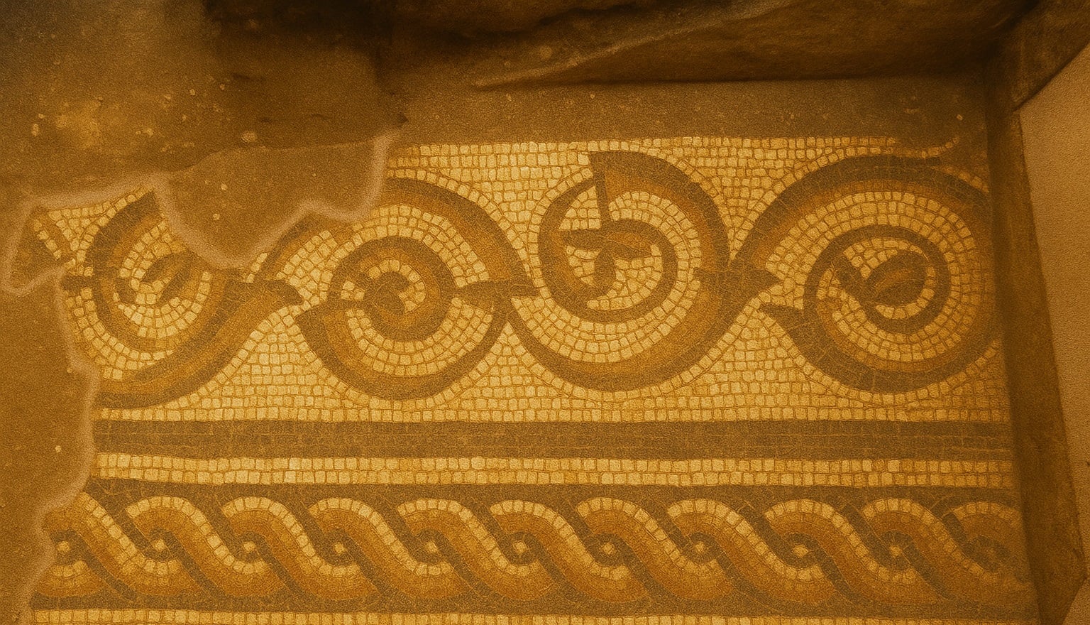 Risale invece alla fase costruttiva iniziale (I. Sec.) il pavimento in opus scutulatum della parte sud dell’edificio, caratterizzato da inserti marmorei irregolari con contrasti cromatici spiccati. Nel segmento meridionale del portico, quello scoperto durante gli scavi del 2006, si trova una stessa tipologia di mosaico calpestabile, ma con l’aggiunta di una soglia decorata con motivo fitomorfo a girali tricrome (tralci vegetali, di vite o acanto, che formavano volute circolari o a spirale) su fondo bianco: un dettaglio che enfatizzava forse un accesso sul portico stesso, con tanto di colonne laterali. Infine, nella porzione settentrionale, i vani comunicanti presentavano altre decorazioni di forgia regolare, tra cui un pavimento in opus sectile e uno in tassellatum.