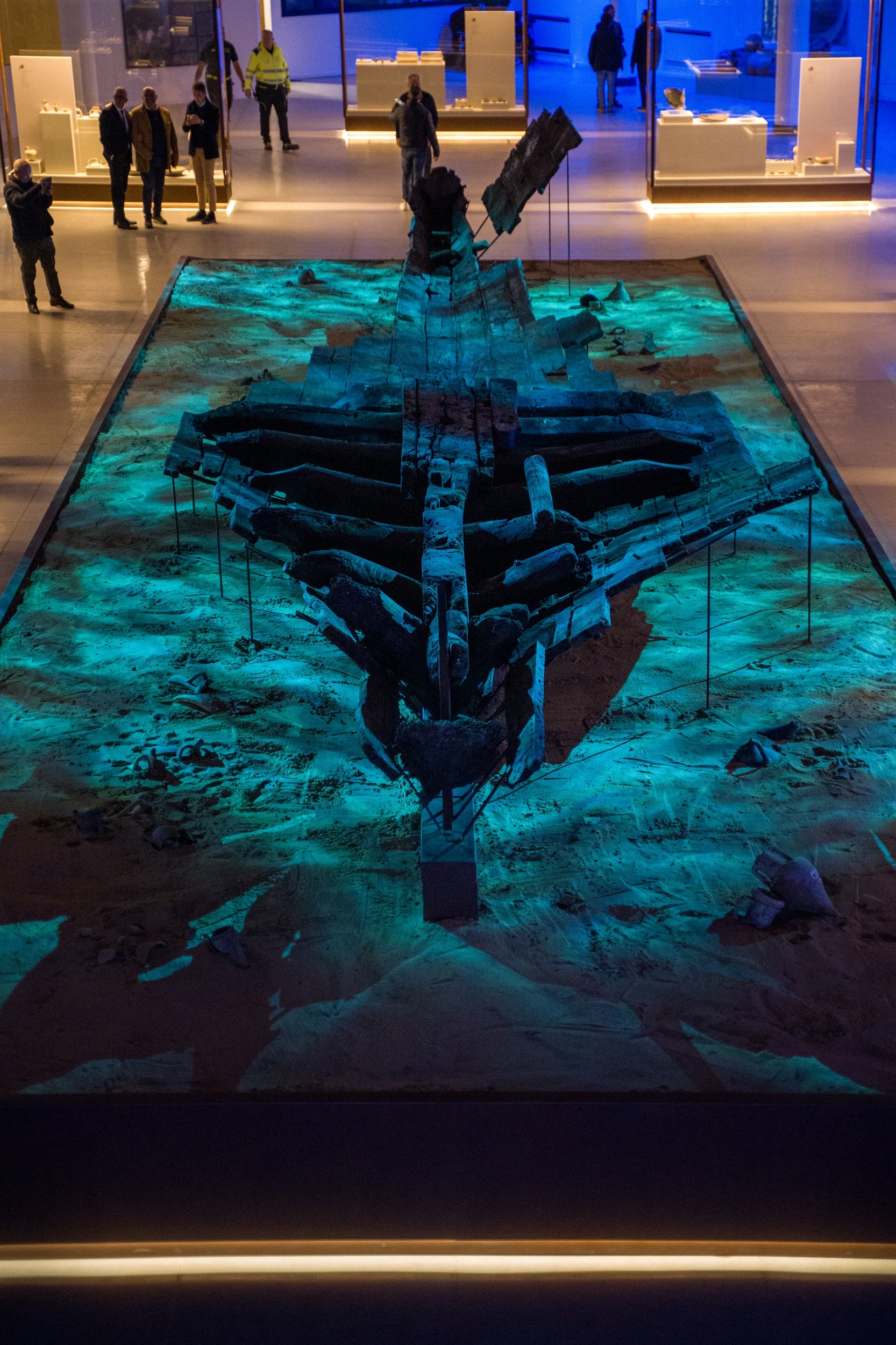 La nave tornò a casa nel 2014, rimanendo in attesa della musealizzazione: occorreva uno spazio adeguato, per dimensioni, condizioni di sicurezza, fruibilità, climatizzazione. Quel luogo non c’era. Si decise di realizzarlo. Dodici anni dopo il Museo dei relitti ha l’ambizione di diventare polo attrattivo per il turismo culturale. L’edificio si articola in un grande corpo centrale dedicato alla nave, preceduto da una sala d’ingresso ettagonale e altri piccoli corpi giustapposti, destinati ad attività didattiche e uffici. La copertura in legno lamellare restituisce la forma di una carena rovesciata, mentre un ballatoio percorre tutto il perimetro, consentendo una strepitosa visione dall’alto. Una cupola centinata convoglia la luce zenitale nell’atrio, punto di snodo dell’intero complesso. È infine firmata dagli artisti Studio Azzurro una saletta immersiva, con lightbox e proiezioni interattive.