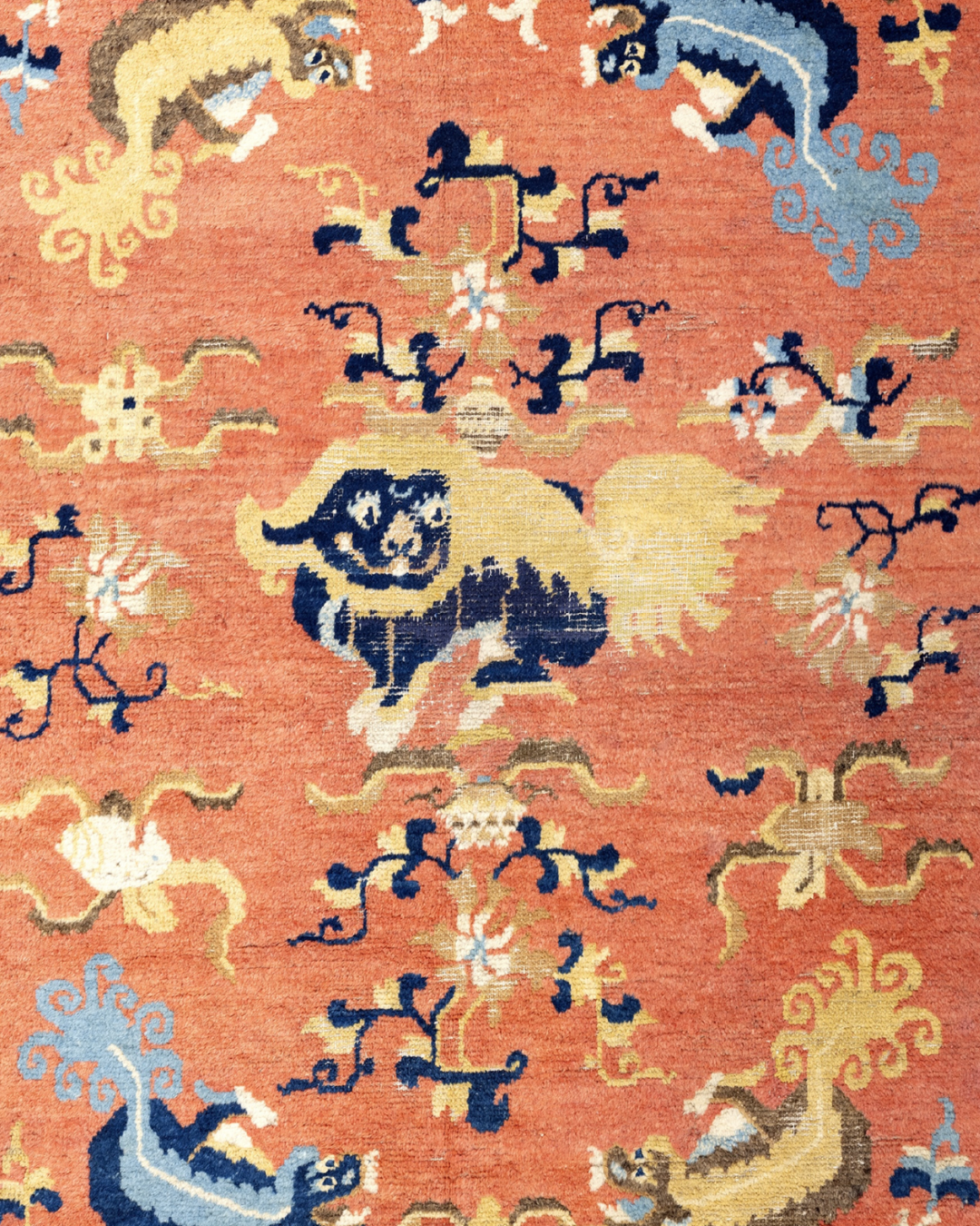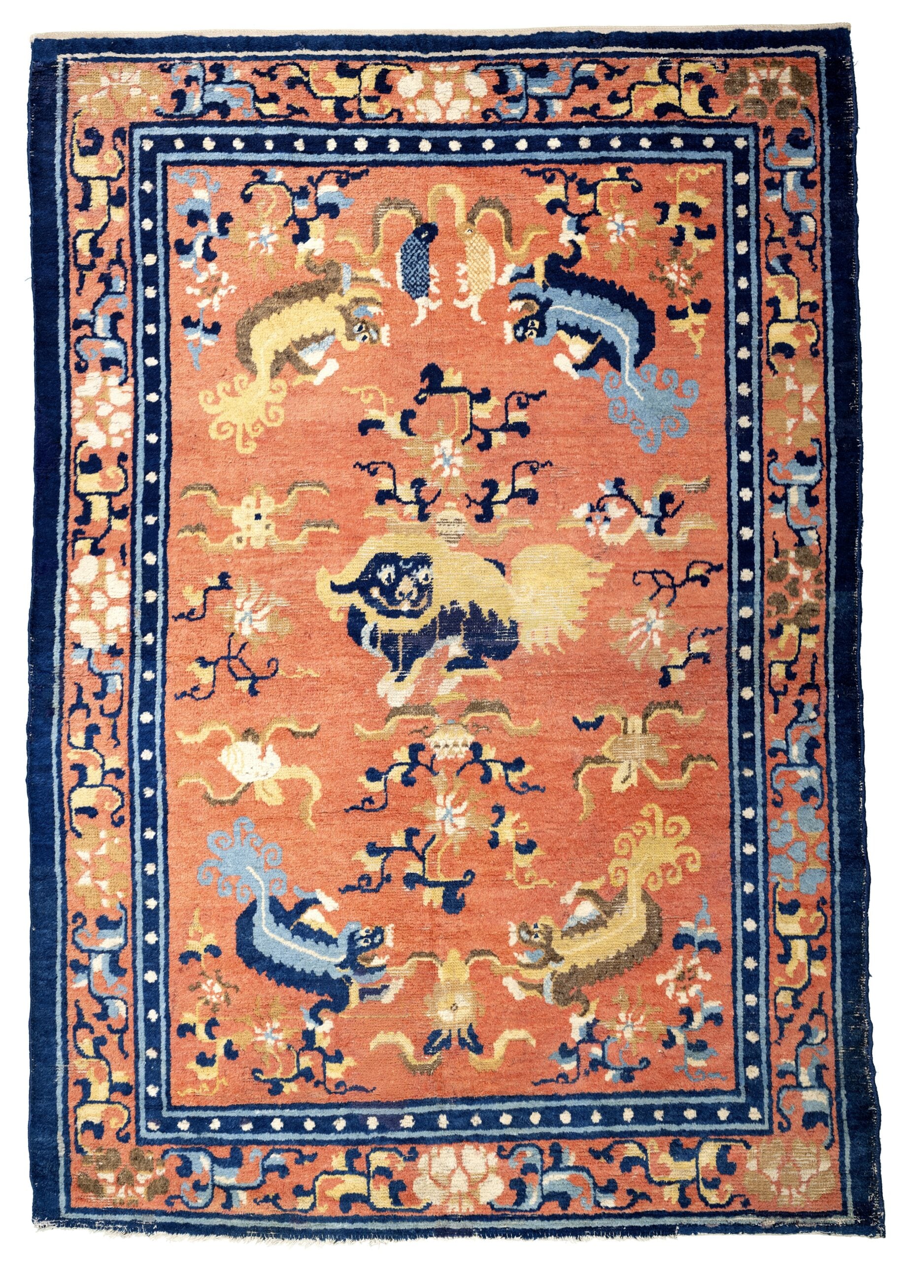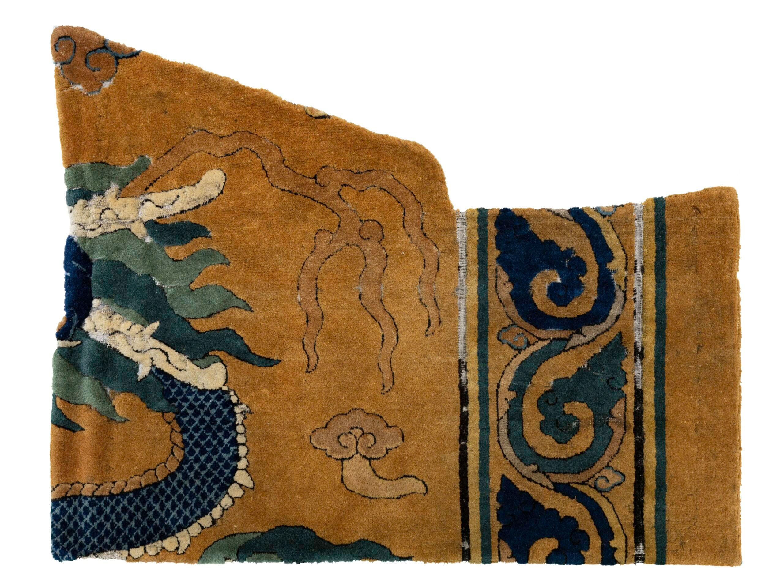 La seconda tipologia in mostra è quella che accosta giallo dorato e blu, riconducibile all’area delle due capitali dei regni Ming e Qing, rispettivamente Nanjing e Beijing. Ecco entrare con forza il tema del dragone, l’animale dell’imperatore, affiancato da nuove simbologie come il pipistrello e la carpa, che per omofonia evocano uno felicità e l’altro ricchezza: questi simboli non riscrivono le antiche geometrie ma vi si sovrappongono con eleganza. La rielaborazione è continua: tra una chimera-drago e un cane-leone, l’immaginario cinese sembra offrire infiniti spunti, dagli auguri di buon auspicio alle rappresentazioni allegoriche. Straordinario il tappeto che chiude il percorso, che raccoglie, come se fossero allineati su uno scrittoio, otto gruppi di oggetti simbolici legati a filosofie di pensiero e qualità positive.