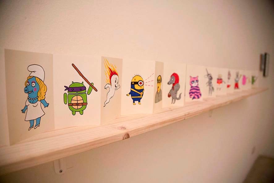 Presenti anche alcune installazioni dell’artista che catturano per originalità e sensibilità. Un mondo popolato da una serie infinita di figuranti, dai cartoon ai film splatter Anni Ottanta e Novanta, per finire con personaggi storici e di fantasia dove nulla è scontato e banale, grazie al dualismo tra bene e male, amore e odio che caratterizza tutte le opere presenti.