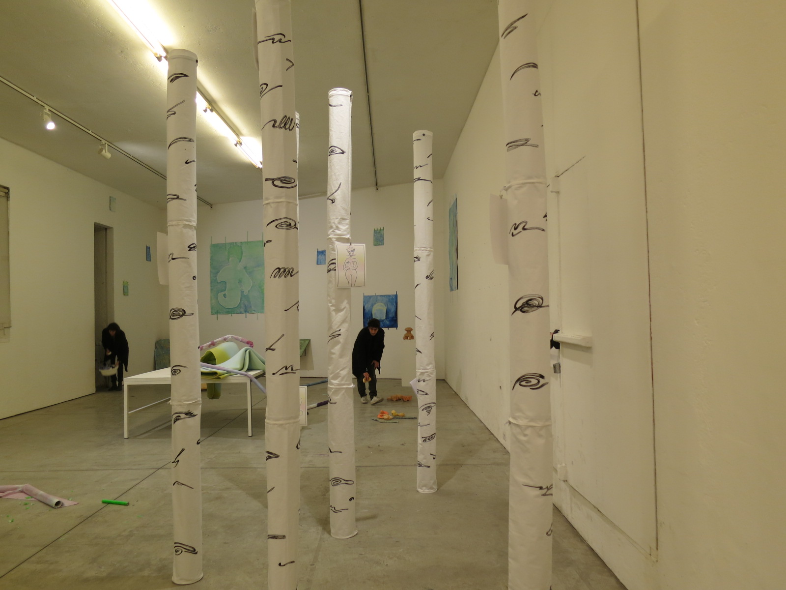 Entrando nella sala principale, alcuni oli su tela, di diverse dimensioni di Francesco Maluta (1983, Lovere, BG), mentre Letizia Scarpello (1989, Pecara. Vive e lavora a Milano) e Rada Koželj (1988, Lecco) intrecciano i loro progetti intersecandoli l’uno di fronte all’altro, fra volumi solidi in equilibrio e neon spezzati. C’è poi l’enorme foresta magica allegorizzata da Giulio Scalisi (1992), A walk through the birch tree forest, 2016, un’installazione tubolare attraversabile, della grandezza di tre metri cubi.