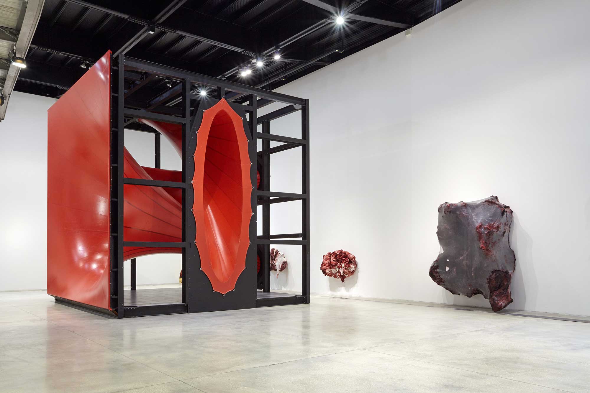 Sembrano urlare, lacerando lo spazio intorno. Espongono la sofferenza brutale delle carni vive, delle bende intrise che a stento arginano il sangue. I colori del corpo, carminio, rosso-blu, bianco, nero, si coagulano in brandelli sovrapposti, fasce muscolari e adipose che emergono fino a formare oggetti colossali, le cui definizioni ne esplicitano ulteriormente il rimando simbolico: Flayed (Scorticato), Hung (Appeso), Dissection (Dissezione), First Covering (Prima copertura), Unborn (Mai nato), Stench (Fetore), Inner Stuff (Materia interiore). Accanto a loro, la superficie nitida e circolare di uno specchio concavo dal colore degradante dal rosso cupo al nero: Mirror (Black to Red), nel cui profondo e oscuro riflesso capovolto l’osservatore si perde.