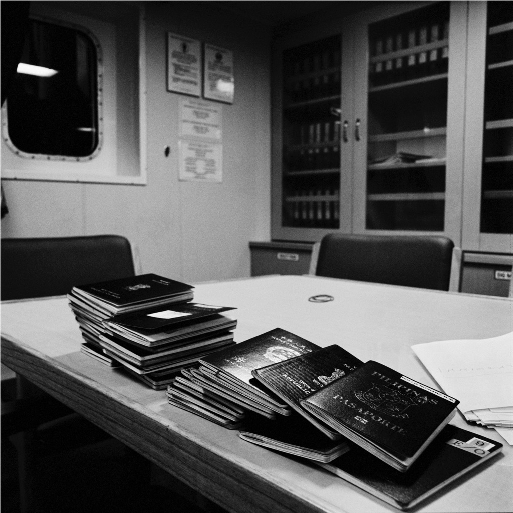 Tae-suk, protagonista del film Ferro 3, si introduce nelle case degli altri, appropriandosi dei luoghi attraverso la cura delle cose. Allo stesso modo Massimiliano Camellini (Venezia, 1964) accompagna i protagonisti di un regno in scala di grigi, conquistando con lo sguardo spazi vuoti e statici, in verità abitati e vaganti. Il fotografo, muovendosi continuamente su navi cargo, registra ogni traccia del quotidiano e rifiuta ogni riparazione data dalla presenza umana. L’acqua non si svela e agisce da padrona. Nel transito, lungo rotte non specificate, riconosce (nelle memorie degli altri) solo un luogo come casa, quello che guarda.