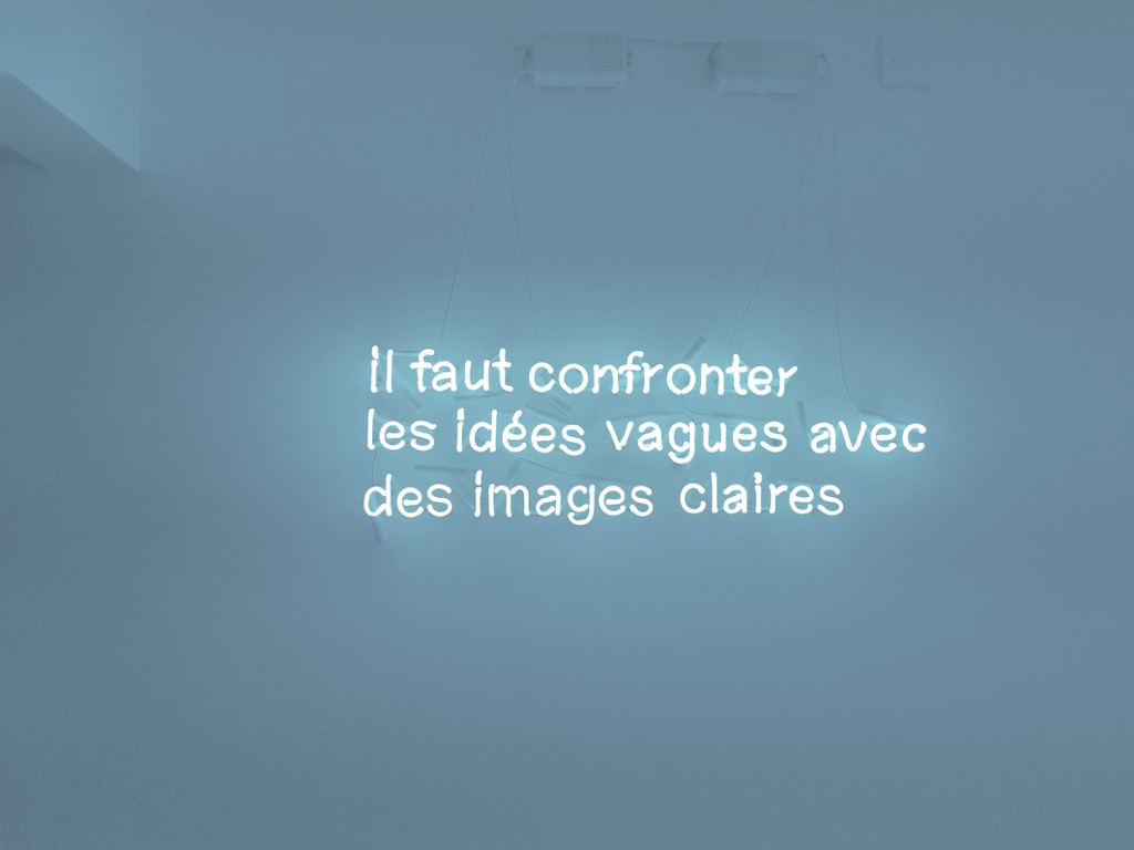 La mostra prende avvio da un monito – che ribalta l’assunto espresso da Godard in La cinese –, da una grande scritta al neon che riporta: “Si deve mettere a confronto idee vaghe con immagini chiare”. Poco lontano, nella stessa sala, sono stati disposti materiali e media appartenenti a pianeti apolidi, gli uni con gli altri. Assemblaggi naturali e artificiali di oggetti ricreano indizi che pongono lo spettatore sulle orme di tracce narrative, di un futuro riletto dal passato, così come lasciano intendere gli interventi organici di Andrea Bocca ed Edoardo Manzoni.