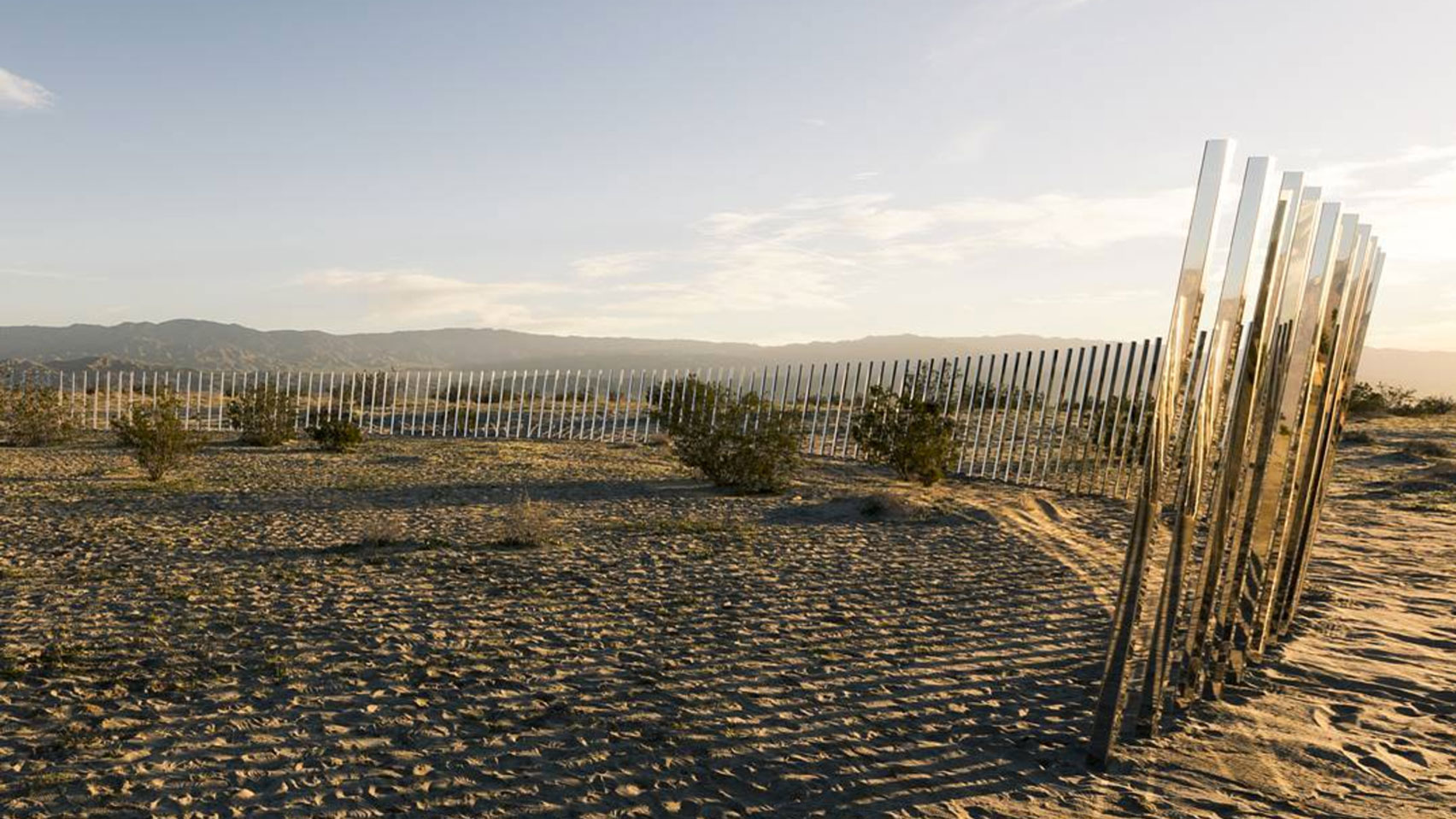 Spettacolari alcune opere, nella loro capacità di integrarsi col paesaggio e di funzionare come landmark in mezzo all’infinita distesa brulla. È il caso di The Circle of Land and Sky di Phillip K Smith, un semicerchio composto da 300 strutture geometriche riflettenti, inclinate a 10 gradi e piantate nel terreno: intercettando l’immagine del cielo e del suolo, i tralicci specchianti espandono, declinano e riverberano il paesaggio, per una modulazione dinamica dell’orizzonte. Gioca sull’effetto ottico anche Doug Aitken, che piazza una casa in stile ranch nel Deserto di Palisades: l’edificio è interamente rivestito di specchi, così da sparire nel contesto, rompendo il limite tra natura e architettura. Quasi un miraggio, un’apparizione magica.