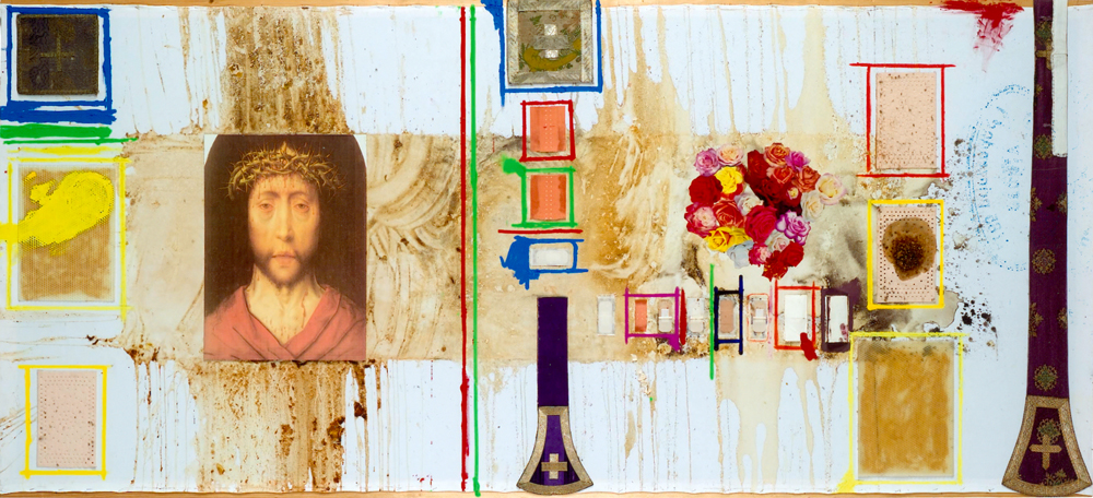 Una pittura viscerale, sanguigna, “violenta”, caratterizza le opere di Hermann Nitsch (Vienna, 1938), opere che (per le grandi dimensioni di 3 metri x 2), possiedono una caratura teatrale, oltre alla forza della passione con cui sono state realizzate. Per questo, osservando la concreta pennellata, la pastosità della materia (tale da far sì che l’olio sembri tempera), pur senza giungere alla carnalità del Teatro delle Orge e dei Misteri, anche queste opere si pongono in equilibrio fra religione e spirito dionisiaco ed esprimono il medesimo conflitto dell’Ecce Homo di Nietzsche, risolvendolo nella “lussuria” della sofferenza a scopo di purificazione. Sterminate campiture di colori primari che sembrano sangue e materia biliare, t-shirt che suggeriscono l’idea della crocifissione e del martirio, a testimoniare le inquietudini della società contemporanea.