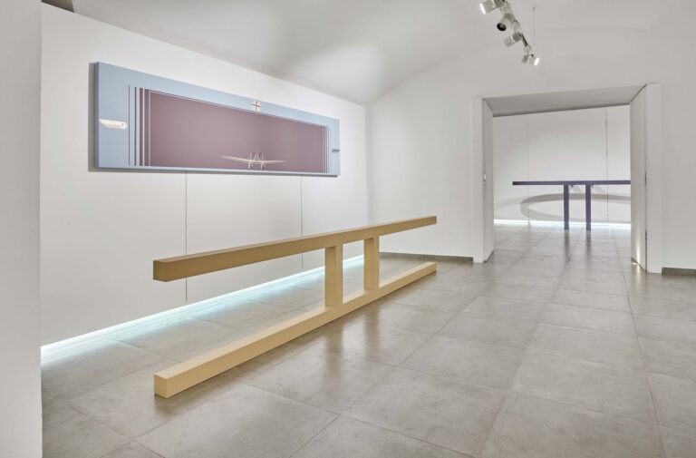 Le trenta opere esposte, combinate in posizioni rigorosamente stabilite, si mostrano come luoghi oggettuali, portali, finestre, veicoli o ali e altre immagini evocative. Molti sono i simboli che, seppur statici, alludono alla velocità e all’accelerazione dal momento che la sua ricerca parte proprio dalla passione personale per la moto, gli aerei e la velocità. Corpi plastici definiti dall’artista “oggetti concreti parareali”, che non vogliono somigliare a quelli reali. Ogni familiarità o quotidianità dell’oggetto viene infatti annullata da una rielaborazione che gli consente di reinventarne la forma. “Realtà aumentata degli oggetti del mondo“, così li definisce la curatrice Francesca Pola nel suo testo in catalogo.