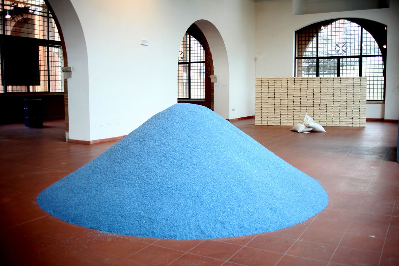Ma i visitatori sono accolti, nella prima sala del palazzo trecentesco che fu Palazzo del Podestà e dell’Arengo, da quattro grandi installazioni di materiale plastico, componente principale del lavoro dell’artista: imponenti volumi di casse per bottiglie d’acqua, un muro di confezioni di riso mantenuto sottovuoto grazie all’involucro, ovviamente di plastica – in queste opere la contrapposizione tra le quantità di materia prima consumata dai Paesi occidentali e da quelli in via di sviluppo è marcata con evidenza –, e ancora balle di bottiglie schiacciate e una montagna di particelle di PET pronte per il riciclaggio.