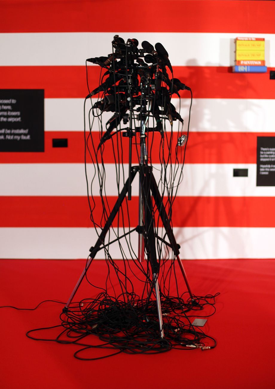 Come sarebbero state le sue opere, se il presidente degli Stati Uniti avesse scelto di fare l’artista? Le avrebbe fatte lui stesso o avrebbe pagato qualcuno per farle? Thomas Kuijpers ha scelto di sfruttare una piattaforma che riproduce dipinti per immaginare un Donald Trump artista, abbinando gli orribili “ritratti” delle sue case ai 34 microfoni che compongono l’installazione Love hate. Mark Dorf riflette invece sulla contrapposizione vero-falso sia nell’uso e imitazione del materiale legno sia nella riproduzione volutamente ritoccata di elementi della natura, che a ben guardare è controllata dall’uomo. Il giovane Kenta Cobayashi “dipinge” digitalmente, con pennellate di pixel, su fotografie analoghe a quelle che siamo abituati a vedere quotidianamente sui social, mentre Olaf Breuning compone sticker dall’aspetto esageratamente kitsch ed evidentemente irriverenti per mettere in discussione le competenze e gli strumenti di cui devono dotarsi gli artisti.