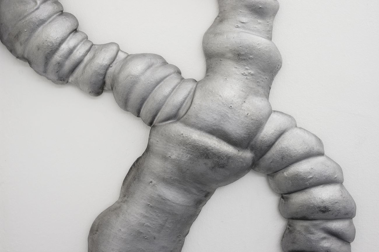 All’origine di tutto c’è lei. La Lupa capitolina, come non l’avete mai vista. Dopo la recente censura da parte della televisione iraniana, il simbolo indiscusso di Roma diventa opera post-minimalista: otto seni in serie, realizzati in forme e materiali spaesanti, come riflessione sul tema della maternità. Un sistema di tubi dell’acqua corre lungo il perimetro delle altre sale come idrovore a partire da un boiler all’ingresso per irrorare tre sculture-termosifone in alluminio, simili a organi umani o a fluttuanti particelle di DNA.
