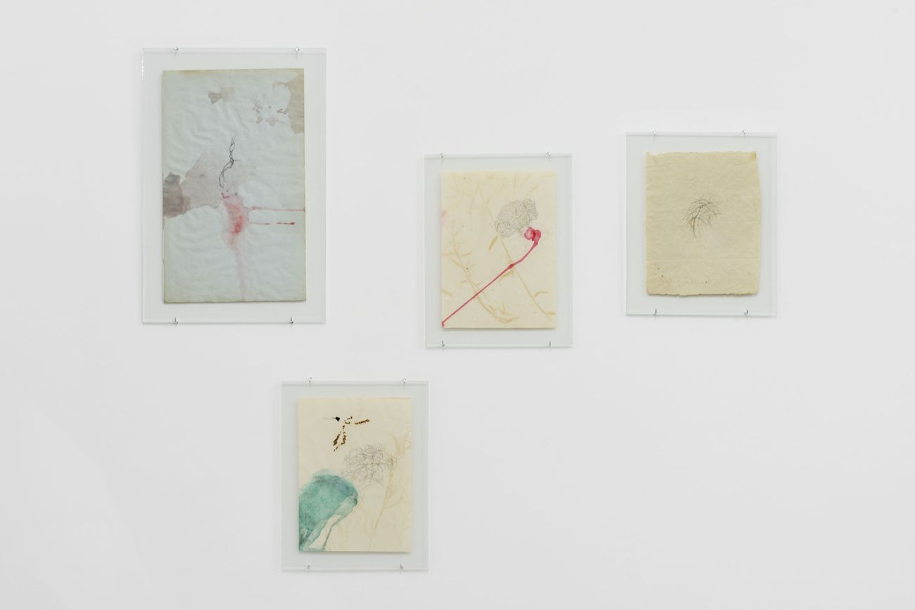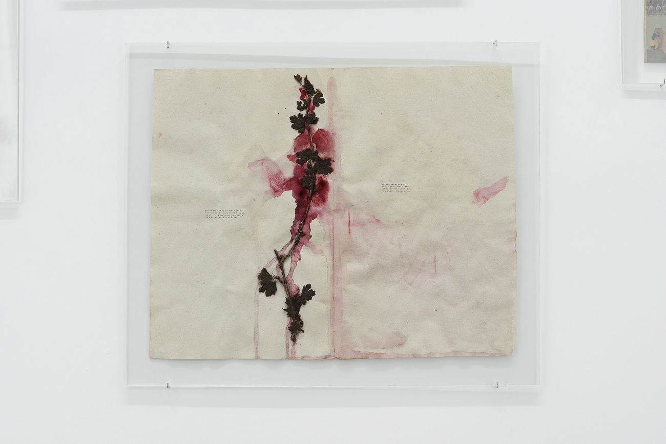Un’artista tedesca piena di complessità, che riesce a districare i concetti riversando sul foglio fiumi di parole miniaturizzate, fili che si intrecciano come reti neurali. Paula Doepfner (Berlino, 1980) disegna disponendo le lettere con cura calligrafica, colora la superficie con reminiscenze organiche, foglie pressate e petali. La natura sfiorisce in una vanitas, racchiusa tra due lastre di vetro ‒ la prima vandalizzata, la seconda infrangibile ‒ provenienti da una banca tedesca.