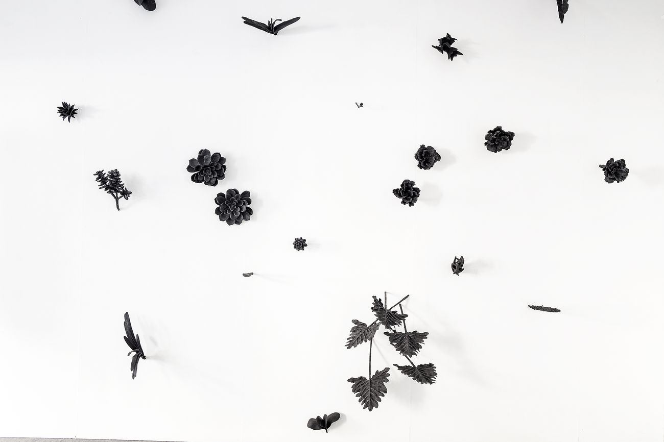 “Le sculture sospese costituiscono l’opera Idroponica (una tecnica agronomica che si usa per coltivare le piante senza il terriccio): sono delle creature né animali né vegetali, madri putative dell’esposizione. Infine, i disegni su carta giocano sulla sovrapposizione di immagini tratte da vecchie tavole botaniche: i colori predominanti sono il nero e il rosa, che rappresentano forza e fertilità, morte e rinascita”.