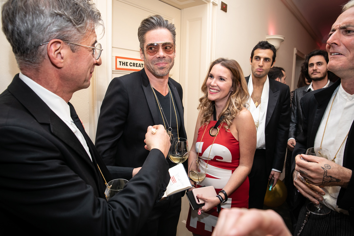Silence! The Party è il titolo dell’evento ideato da Cattelan e che ha coinvolto le 21 stanze del primo piano del Grand hotel et de Milan. Una festa totalmente in silenzio quindi, realizzata in collaborazione con la Maison di Champagne Dom Pérignon. Gli ospiti hanno dovuto seguire un’unica regola, quella del silenzio appunto, comunicando attraverso un taccuino realizzato da Pineider, azienda che realizza strumenti di scrittura e accessori in pelle. In occasione dell’evento, ventuno lussuose stanze dell’hotel sono state trasformate da Cattelan in palcoscenici inaspettati con allestimenti irriverenti e surreali per gli ospiti: letti a baldacchino ricoperti di peluches e palloncini, vasche da bagno colme di ortaggi e champagne, salumeria allestita all’interno di cabine armadio, sushi preparato negli storici bagni. In un’atmosfera in cui l’unico suono è stato il tintinnio dei calici di champagne, gli invitati sono stati intrattenuti da inaspettati e taciti performer: un’origamista, un grafologo, una caricaturista, un poeta estemporaneo, una silhouettista, una cartomante e anche l’astrologo Antonio Capitani. Vi state chiedendo chi c’era alla festa? Tra gli ospiti Pierpaolo Ferrari, Paola Manfrin, Melissa P, Massimo Giorgetti, Fabio Volo e Johanna Maggy, Arisa, Teresa Guccini, Stefano Seletti, Geppi Cucciari, Charley Vezza, Camila Raznovich, Roberto Pisoni, Antonella Rodriguez Boccanelli, Anna Dello Russo, Paola Barale, Job Smeets e Rebecca Sharkey, Umberta Gnutti Beretta, Lady Tarin, Fiammetta Cicogna, Marica Pellegrinelli, Ludivine Pont, Alberto Zanetti, Mara Venier, Marsica Fossati, Filippo Cirulli, Filippo Fiora, Jane Balzarini, Teresa Guccini.