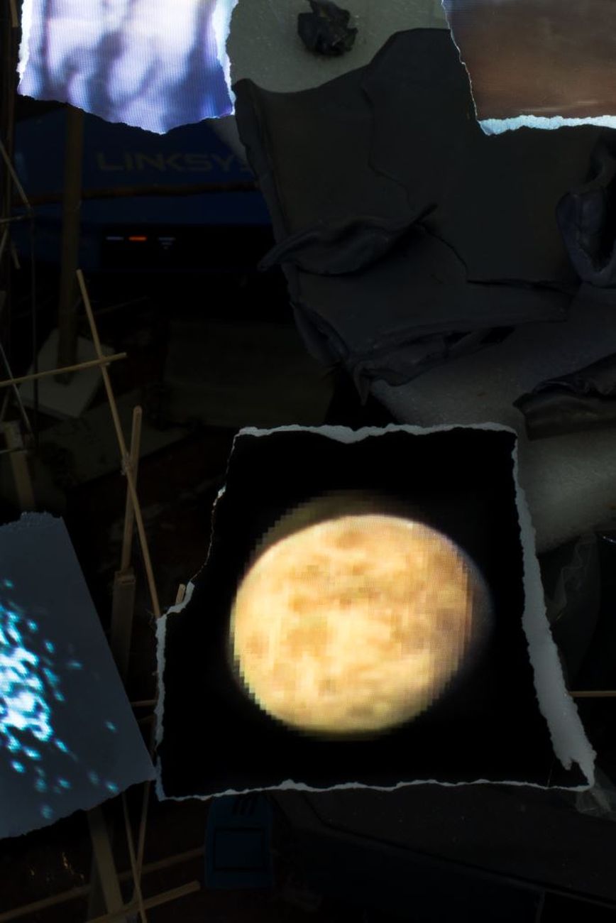 Il turbinio emotivo rievoca ricordi, sensazioni e momenti vissuti, condensando in essi il senso reale della vita. Le immagini sono particelle di luce, talvolta di inchiostro altre volte di pigmento; dallo schermo alla tela oltrepassano le strutture che le comprendono, lasciando visibili segni anche sul pavimento. In questo modo il passaggio dalla bidimensionalità dei dipinti alla tridimensionalità dell’installazione è fluido e immediato. Il percorso visivo conduce dal collage alle mutazioni visive, dalla tela ai vorticosi elementi cosmici.
