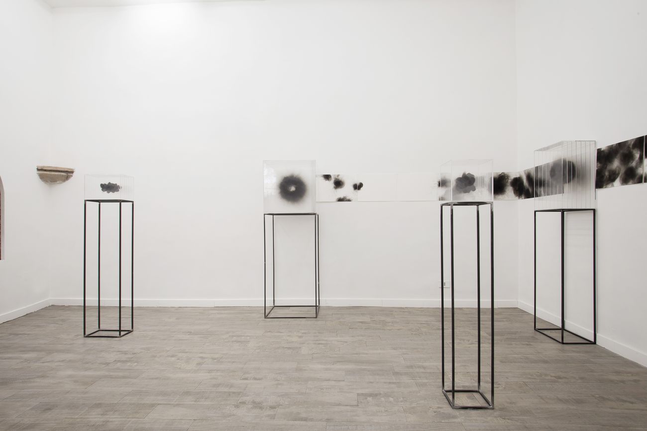 White Noise Gallery, Roma – fino al 9 marzo 2019. Cubi da esplorare con lo sguardo. La vista frontale di teche leggere congela in trasparenza nuvole bianche, sospese senza mai essere pioggia, e fumo cupo, morte in nero di un vortice in espansione.