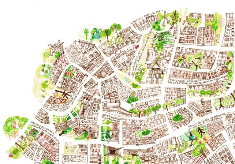 I protagonisti della collettiva ospitata dalla galleria veneziana mettono in atto il medesimo gesto, ricorrendo al disegno “nudo e crudo” come lente d’ingrandimento da puntare sull’oggi. Ne emerge un mosaico complesso, fatto di dettagli che restituiscono le fattezze di una quotidianità dove corpi, denaro, povertà, confini e natura sono solo alcuni degli attori in scena su un palcoscenico globale sempre meno rassicurante. La Babele di Alberto Tadiello risuona nelle mappe di Rebecca Agnes, affollate di paure e pregiudizi, mentre i confini effimeri degli Impresari sembrano rispecchiarsi nell’Europiave di Matteo Stocco o nelle linee orizzontali degli Still Life di Guendalina Cerruti. Se l’onnipresenza del denaro ‒ e la sua assenza ‒ accomunano i lavori di Ryts Monet e Davide Sgambaro, la diffidenza verso l’altro è il motore delle riflessioni di Enej Gala, Lia Cecchin e Roberto Fassone, così come l’odio e la rabbia abbozzati da Rebecca Moccia riecheggiano nei vizi capitali vermiglio di Sulitane Tusha. Piccoli assaggi di un eterno presente, che si fa materia, colore, linea.
