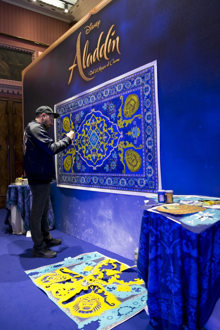 Ha raccontato Koi: “realizzare il tappeto magico di Aladdin è stata per me una grande sfida. Sono sempre stato attratto dai disegni dei tappeti, sia esteticamente che per il simbolismo che li contraddistingue. Nell’ antica Arte di realizzare tappeti, ogni dettaglio rivela un linguaggio nascosto. Prima di iniziare la mia opera ho studiato tutto quello che c’era da sapere, dai valori e i significati dei tappeti arabi alla storia del tappeto volante nel poema epico 1000 e una notte. Non è stato semplice dal punto di vista tecnico ma sono molto soddisfatto del risultato. Ho utilizzato 14 layer diversi di stencil che ho ritagliato a mano, colori acrilici, pittura a pennello, rullo, spray 2mX140cm. Ho lavorato alla preparazione per diversi giorni e poi terminato l’opera a Milano LIVE durante la premiere del film. Un’occasione davvero bella per uno street artist come me. La passione per la Street Art mi ha avvicinato negli anni al mondo dello stencil. Gli stencil multilayer sono i miei preferiti. Realizzare uno stencil, cercare le ombre, scegliere i colori è molto difficile, andando avanti però mi sono innamorato di questa tecnica e non l’ho più abbandonata”.