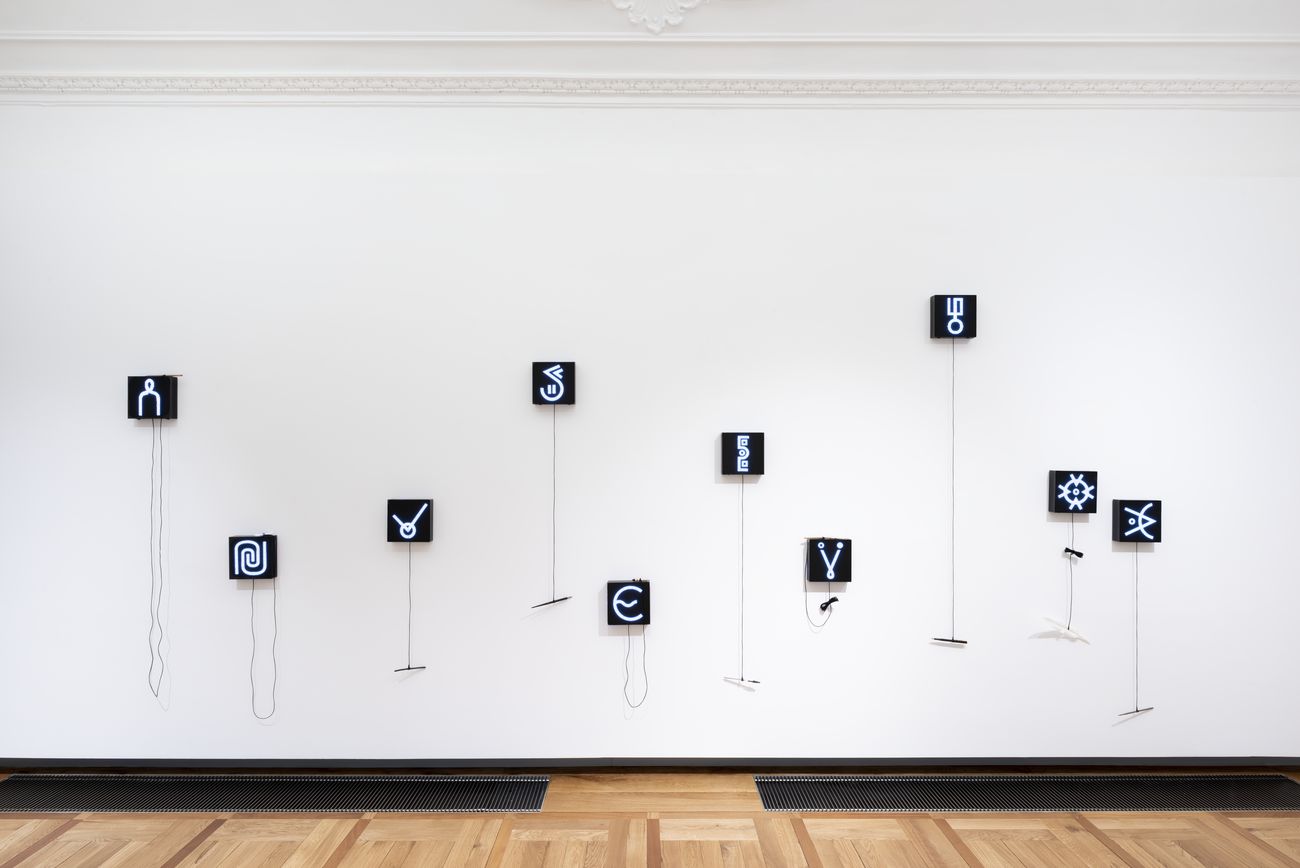 I segni della scrittura cinese rappresentano originariamente gli oggetti cui si riferiscono con la loro forma esterna, come se segno e disegno si congiungessero; e nonostante le linee della scrittura moderna abbiano fatto perdere a molti caratteri i loro rapporti con gli oggetti, i dizionari dei caratteri antichi permettono facilmente di trovare l’etimografia dei recenti. L’esempio, in questa sede, è necessario per chiarire le ricerche sul linguaggio che David Reimondo (Genova, 1972) ha compiuto: un’Etimografia (titolo del suo demiurgico progetto di generazione di simboli, oggi esposto per la prima volta presso la galleria Mazzoleni dopo otto anni di gestazione, dal 2010 al 2018) che trasforma lo studio della fonetica e della morfologia in sculture e installazioni, con una tecnica mista che attraversa la stratigrafia delle possibilità contemporanee – dal legno colorato con inchiostro nero per stampanti alla cartapesta; dagli aghi e dai fili di cotone ai pannelli LED RGB.