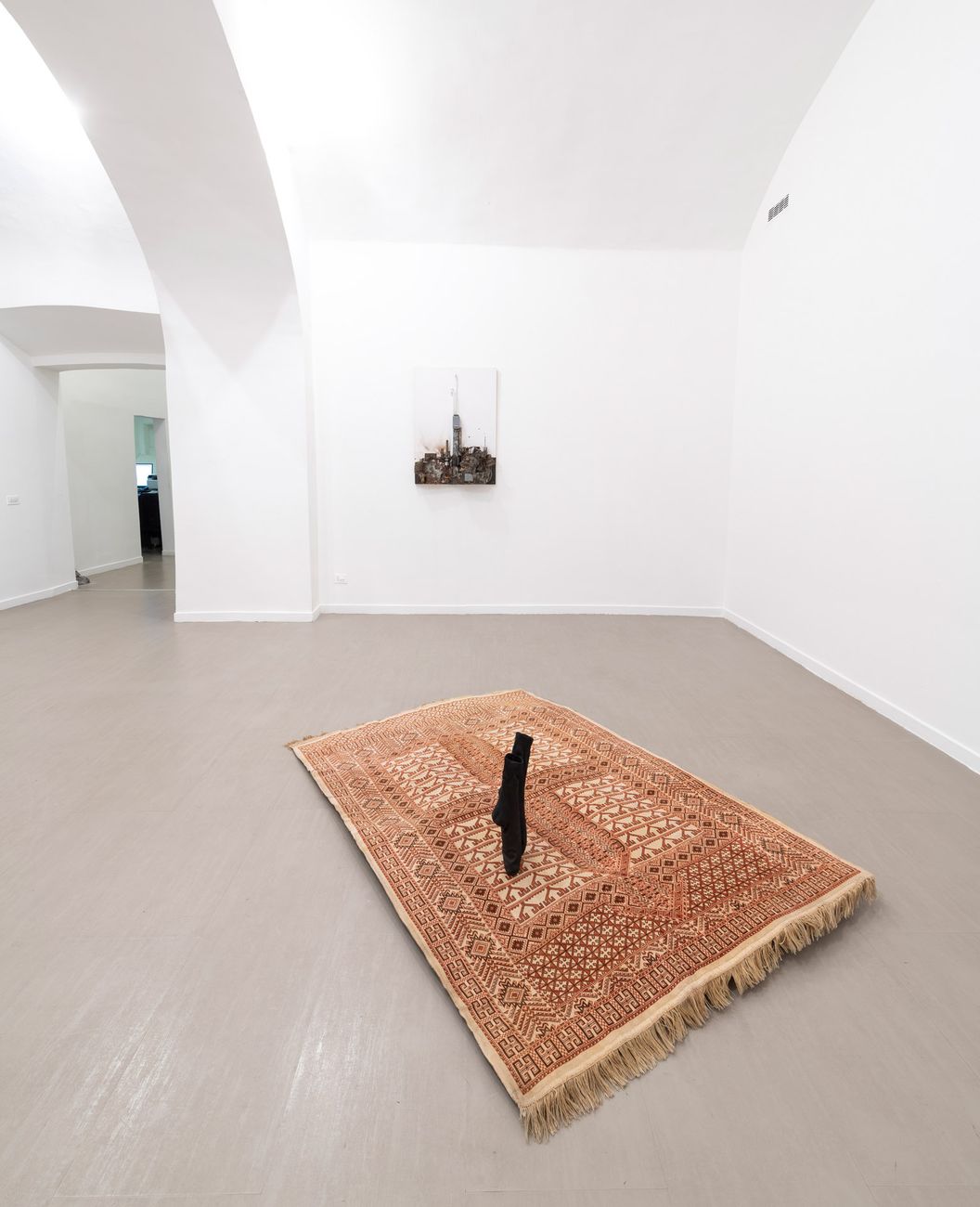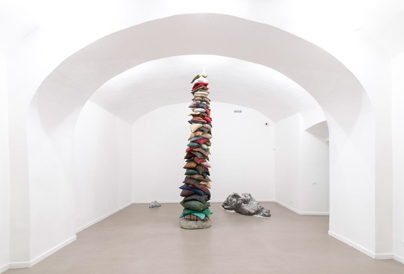 No One Has Nothing è un percorso che mette insieme un intervento site specific e alcune opere storiche. A partire dall’ingresso, su cui campeggia un grande cartello con il titolo della mostra vergato a mano, e attraverso la ricostruzione di uno spazio-laboratorio, sonorizzato e disseminato di tavole, sculture, cavi e strumenti di lavoro, lo spettatore viene catapultato nel cuore del processo creativo di Kintera, quasi simulando l’esperienza di uno studio-visit. Il prologo caotico lascia poi spazio, nelle sale successive, a un momento espositivo più disteso e sognante, punteggiato di immagini surreali ed evocative, come la neve sciolta e sporca, l’altissima colonna di cuscini e il tappeto volante con i due calzini lasciati vuoti, residui di un’umanità ormai dissolta, come evaporata. L’atmosfera oscilla continuamente tra un testardo desiderio di resistenza ‒ rappresentato da cartelli, bandiere e transenne ‒ e un malinconico senso di inevitabilità. L’arte diventa, per Kintera, uno strumento di riflessione che si appoggia saldamente al linguaggio della poesia visiva, trasformando i detriti in immagini, i pensieri in visioni, la disperazione in volontà di resurrezione.