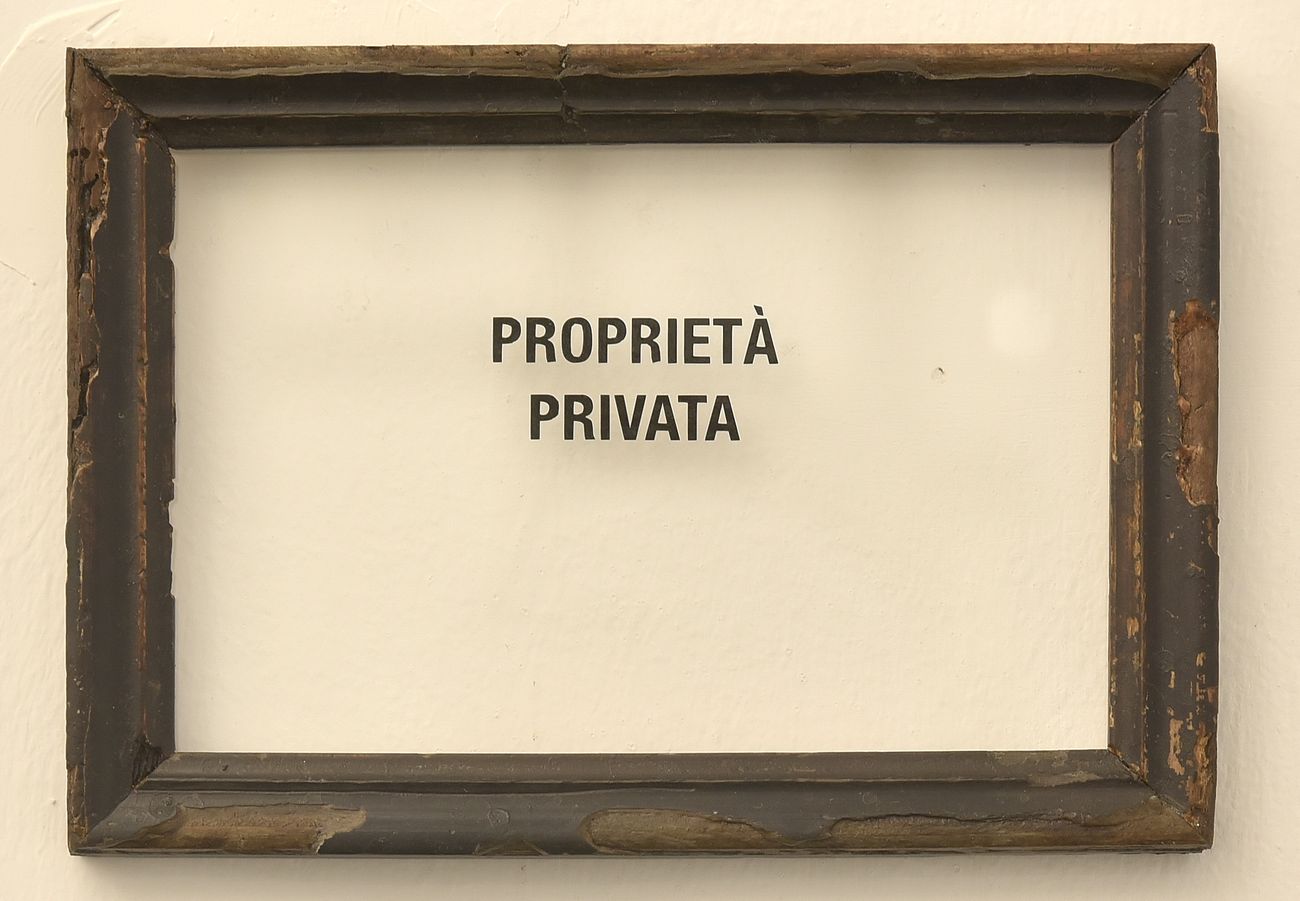 L’esposizione sorprende per la sua pulita e serena eleganza; una raffinatezza tecnica che l’artista ha raggiunto, come suo solito, un po’ per meditazione e un po’ per gioco (che, per Gianni, sono due facce della stessa medaglia): lo spazio della galleria è tappezzato di 120 cornici che custodiscono i vetri con la dicitura “proprietà privata” riportata in circa 45 lingue diverse. Le opere-cornici rifiutano la funzione di puro manufatto estetico, vere e proprie finestre che si spalancano concedendo uno sguardo critico sulla società dello spettacolo e dello “show” delle mostre contemporanee.