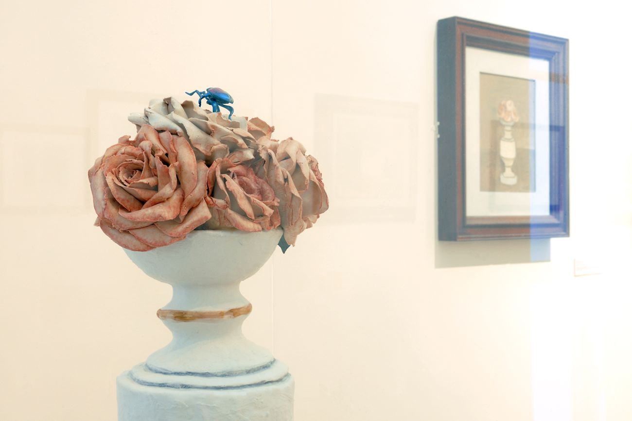 Di rose, precisamente, è quel “mazzolin” protagonista di un piccolo ma raffinatissimo focus espositivo allestito nel corridoio centrale del Museo Morandi di Bologna: uno stesso soggetto è infatti ritratto nei dipinti di Giorgio Morandi e nelle sempre sorprendenti ceramiche del duo imolese formato da Giampaolo Bertozzi e Stefano Dal Monte Casoni. Le rose del pittore bolognese, ancora oggi conservate nella casa di via Fondazza, erano essiccate o di seta: fiori finti, destinati a raccogliere la polvere, “creando effetti tonali a Morandi per nulla sgraditi e forse per questo volutamente ricercati”. E altrettanto finte sono le rose di Bertozzi & Casoni, la cui abilità nel comporre opere in ceramica è fuori discussione, come fuori discussione è la loro profonda riflessione sulle capacità dell’arte di imitare la natura, al contempo stravolgendola e creando, con accostamenti particolari, contesti inediti che talvolta sfiorano il Surrealismo. I tre vasi realizzati in omaggio a Morandi, vere e proprie sculture dipinte, rievocano quel senso fiammingo di natura morta che è anche memento mori, meditazione sulla caducità della vita e delle cose materiali; non a caso sui petali si appoggiano tranquilli dei coleotteri; “la vita. Finta sì, ma che par vera”, sentenzia un ammirato Eugenio Riccomini nella presentazione della mostra.