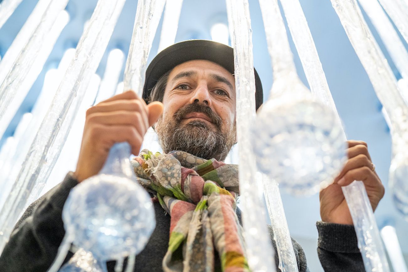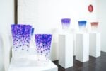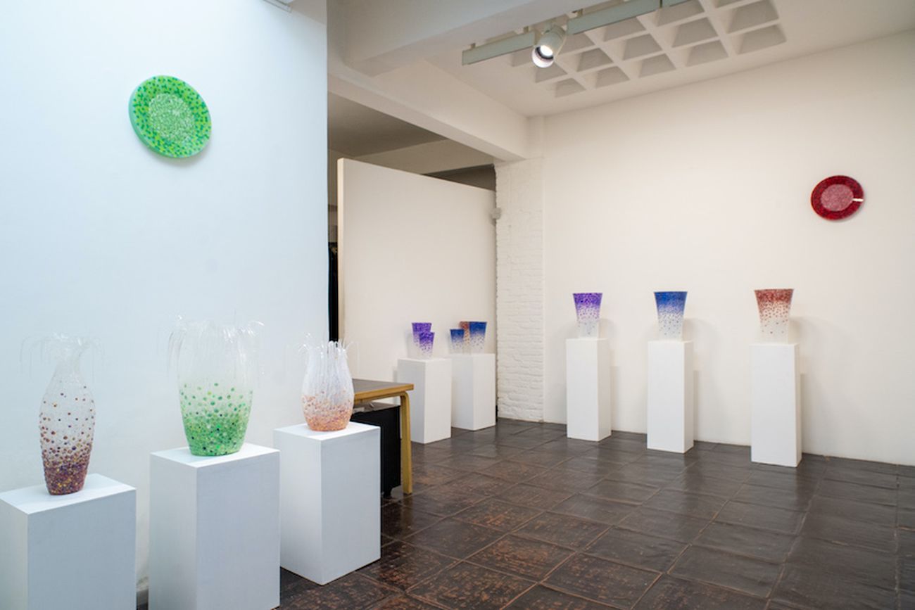 Murano 5.0, la sua nuova personale alla Galleria Paola Verrengia, si apre con una grande installazione – parte di Sinapsi (2018), presentata lo scorso anno nello studio di Roberto Coda Zabetta – che scende dal soffitto e invita a un attraversamento luminoso, a cui seguono, poi, tutta una serie di progetti che rigenerano la murrina o l’anfora (le tre presenti in mostra sono concepite ad anelli sovrapposti) per offrire nuove e cromaticamente squillanti forme di silicone, come vetro, come ambra, come goccia…