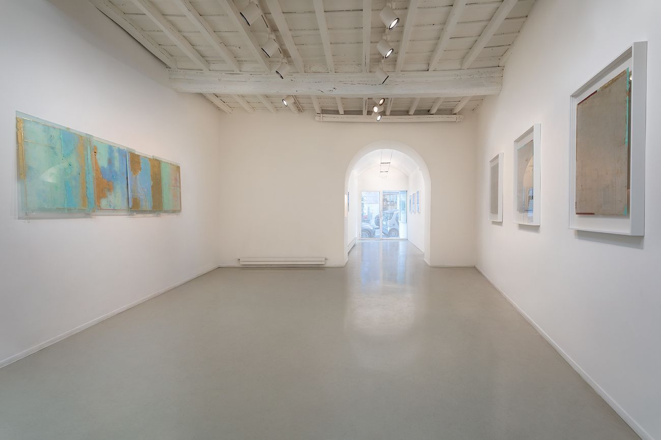 Lì dove il tappeto prezioso si stende e irradia la luce, “l’artista inizia un meticoloso processo di scavo […] che lascia emergere, in piccole aree e lungo i margini, gli strati sottostanti, la vita materiale del dipinto”, scrive Davide Ferri nel suo testo critico. Ad accogliere le stratificazioni irregolari è anche il vetro nell’installazione ambientale nella grande sala, donando luce e volume ai dipinti e armonizzandosi con i restanti lavori.