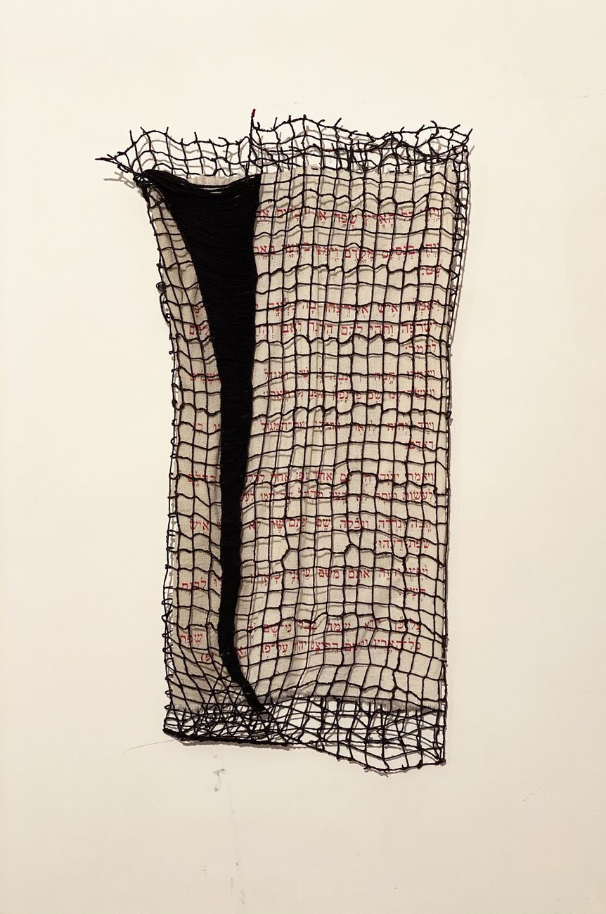 Se per RAR testi dissimili sono stati uniti mediante l’analogia, al centro della riflessione di Levenim לבנים vi è il rapporto tra la parola e il gesto creativo collocati alla base della costruzione della realtà. Federica Patera ha scelto come punto di partenza per la sua opera il passaggio della Genesi dedicato alla Torre di Babele [Gn 11, 1-9] nella versione in ebraico, per poi proseguire in un viaggio linguistico attraverso la traduzione degli stessi versi in altre lingue: greco, latino, italiano, francese, inglese, tedesco, spagnolo e portoghese, creando così sfumature diverse dello stesso testo. Il materiale principale utilizzato è la lana la quale, cucita a mano e indurita con gesso e stucco, crea una rete verosimigliante ai mattoni della Torre di Babele, ma che poi progressivamente si trasforma perdendo la rigidità e diventando qualcos’altro, senza però che si smarrisca il peso del materiale iniziale.