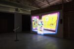 L’esposizione ci guida all’interno dello shed attraverso installazioni immersive che sono frammenti di realtà, un universo di pop-up dove tutto è tangibile ma niente è assoluto. L’artista disorienta lo spettatore rappresentando la decentralizzazione che caratterizza il web: un mondo in cui non esistono le gerarchie, ma tutti possono contribuire a comporre un nodo della rete. In questo senso l’artista è un “editor” che assembla informazioni attingendo da ciò che già esiste, scomponendolo e ripresentandolo. Questa pluralità, destinata a moltiplicarsi esponenzialmente, trova espressione in particolare negli host (A, B, C), figure accattivanti contraddistinte da colori diversi e corredate da monitor che cercano di ammaliare lo sguardo presentando estratti della filmografia di Beloufa, dandoci l’illusione di scegliere quando sono loro a scegliere per noi, proprio come gli algoritmi. Queste menzognere sculture sono acquistabili come NFT e scambiabili sul web come criptovaluta.