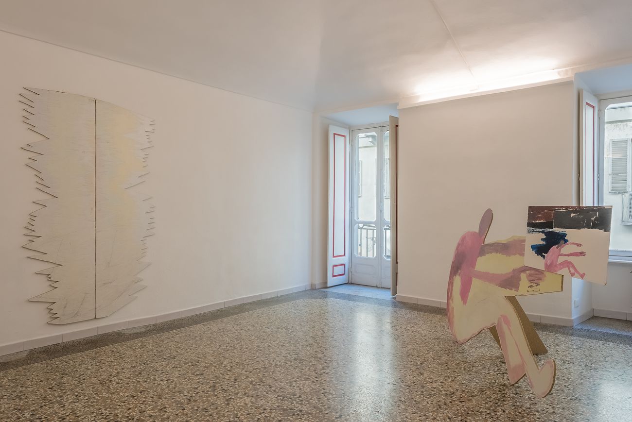 Partiamo dall’inizio: andata/Milano. Città dove vive l’artista e sede della redazione di Forme Uniche. Un ufficio definito da Margiacchi “luogo nomade e condiviso”, stazione perfetta per ospitare il momento di ricerca dell’artista; il fermento delle idee brulicanti che, pur nella loro primigenia confusione e nella loro continua migrazione, custodiscono la consapevolezza di fissarsi presto nella materia. È qui che cominciano a emergere dalle pareti, seguendo traiettorie parallele fluttuanti, gli arti dipinti da Barzaghi: misura approssimativa di lunghezza e quindi unità di percezione della distanza; ma anche sintesi della gestualità e monito di direzione; ipotesi di tutte le traiettorie possibili. “Sono truciolati che nascono nella composizione bi-dimensionale del disegno e della pittura”, spiega Margiacchi, “che poi si staccano dalla superficie della tela per aprirsi nella terza dimensione, lasciando la funzione di fine diventando mezzo: non è più una lotta nell’intento di riprodurre il tempo (come nella pratica pittorica) ma diventa necessariamente arte del tempo”.