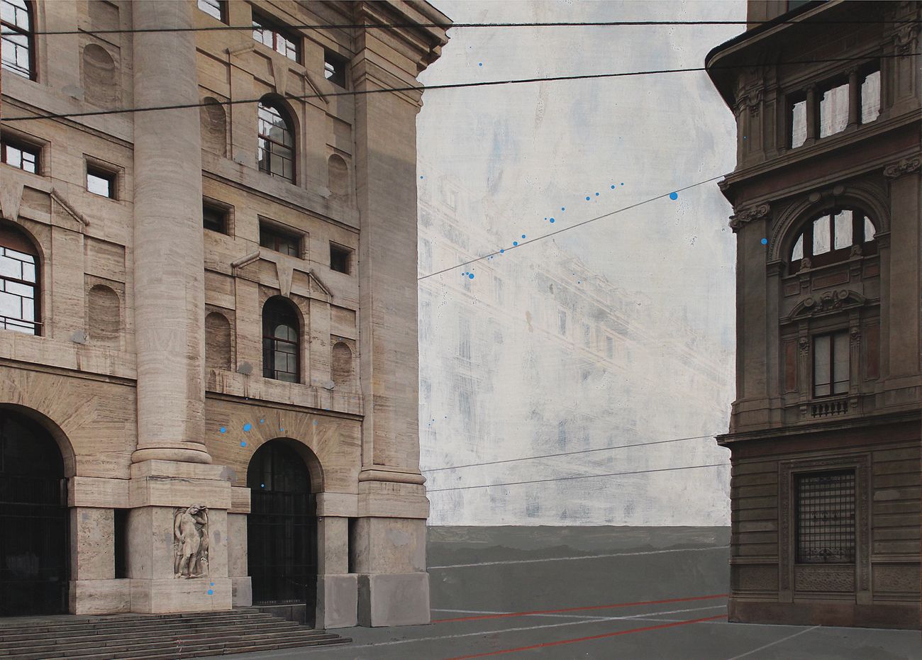 Nella città dell’artista il suo intervento pittorico cancella tutto ciò che crea disordine e distrae dalle forme solide e dalle linee grafiche delle architetture, mette in evidenza i vuoti e i pieni creati dalle trasformazioni urbane, nasconde ogni riferimento alla presenza umana. A guidare la mano di Ventura è un’esigenza estetica, ma anche una riflessione sulla trasformazione epocale in atto a Milano e accelerata dalla pandemia.