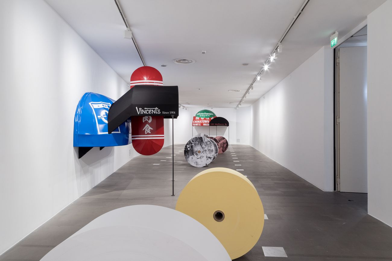 In mostra al MAN ci sono le installazioni scultoree, i disegni, le insegne e le tende parasole sovrapposte di diversi negozi italiani e cinesi, sulla pavimentazione sette oggetti cilindrici realizzati con rotoli di carta industriale ‒ a evocare quelli delle tipografie cinesi depositati sui marciapiedi prima di utilizzarli ‒, pesanti oltre duecento chili e inamovibili da una sola persona, ai cui lati sono serigrafate in bianco e nero immagini fotografiche di Little Italy.