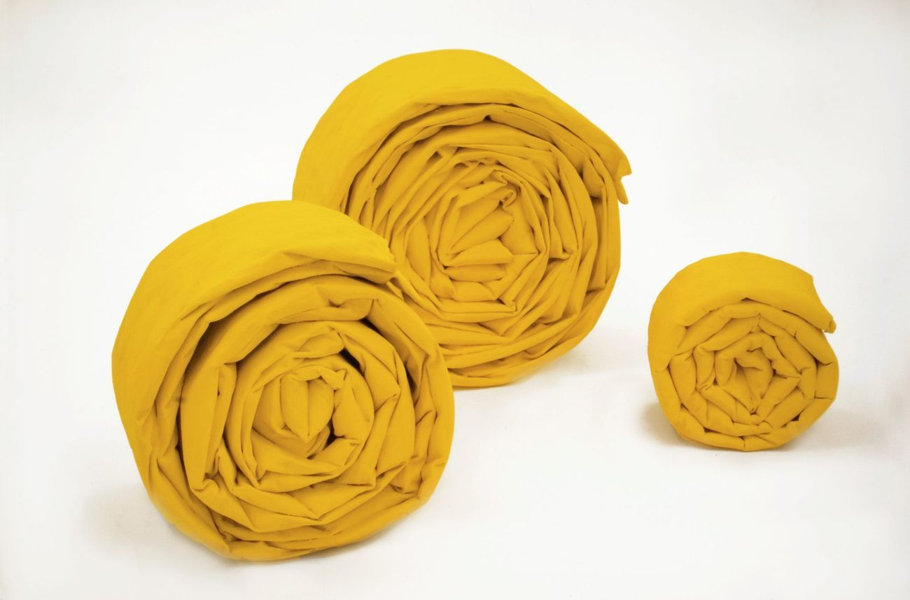 Sulla parete centrale della seconda sala si staglia Costellazione (2017), un lavoro composto da tele piegate di diversa grandezza disposte ad angolo. Di nuova produzione, invece, la serie dei Volumi (2019-20) in cui l’estroflessione sostituisce la piega. Spostandosi nell’altra ala ci si imbatte nell’iconico Avvolgere la notte (2013) caratterizzato da una illuminazione blu che richiama il colore dei rotoli di stelle, disposti in verticale come tante torri di Babele.