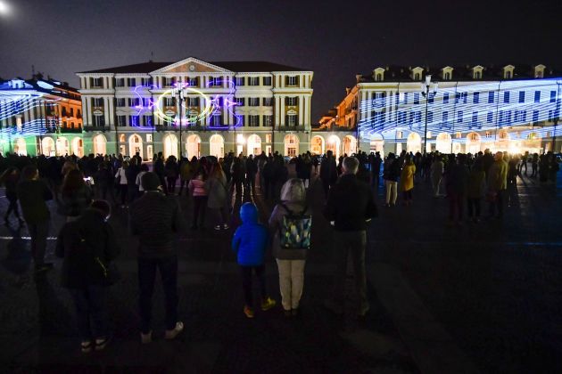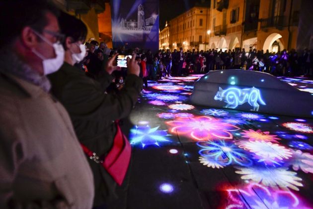 A Cuneo le videoinstallazioni di Cuneo Provincia Futura sono sei. Sulla facciata di Palazzo Vitale, sede della Fondazione CRC, videoproiezioni dinamiche con protagonista un piccolo robot, mentre la piazzetta del Grano diventa un fiume in piena per riflettere sulle conseguenze dello scioglimento dei ghiacciai con un set tridimensionale e un videomapping immersivo a 360°. In piazza Virginio il tema della conquista dell’immortalità è incarnato da ologrammi tridimensionali sospesi nel vuoto, tra luci al neon e specchi d’acqua vera, mentre nel cortile del Complesso di Santa Croce quello sulla deforestazione è inserito in una scenografia luminosa creata da ledwall, videoproiezioni e luci architetturali. Infine, da piazza Europa, con le videoproiezioni sulle fronde degli alberi, cedri dell’Atlante, di immagini di animali in via di estinzione, il percorso va a concludersi in piazza Galimberti con un monumentale laser mapping che si sviluppa su 3.000 metri quadrati di superficie per affrontare il tema dell’intelligenza artificiale e della quarta rivoluzione industriale, il processo che porterà alla produzione industriale del tutto automatizzata e interconnessa.