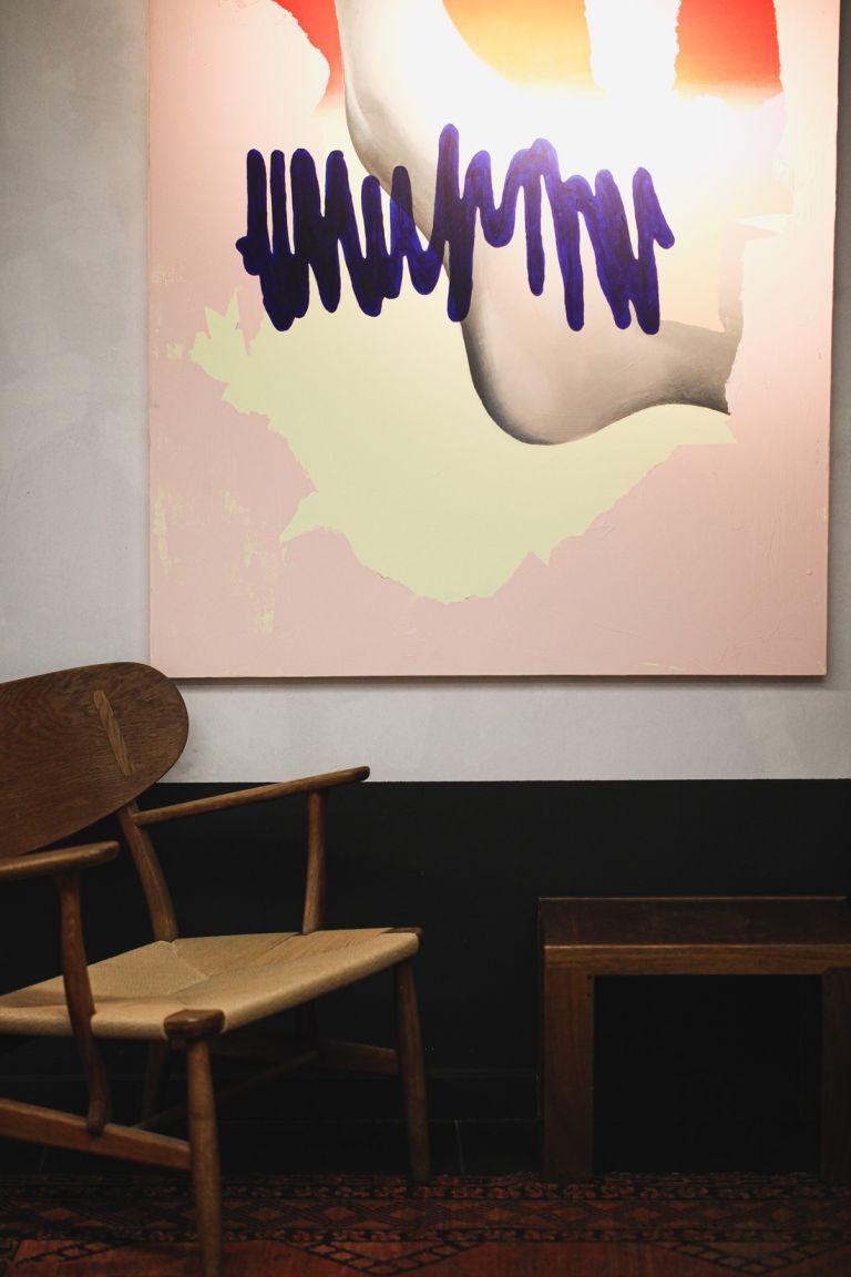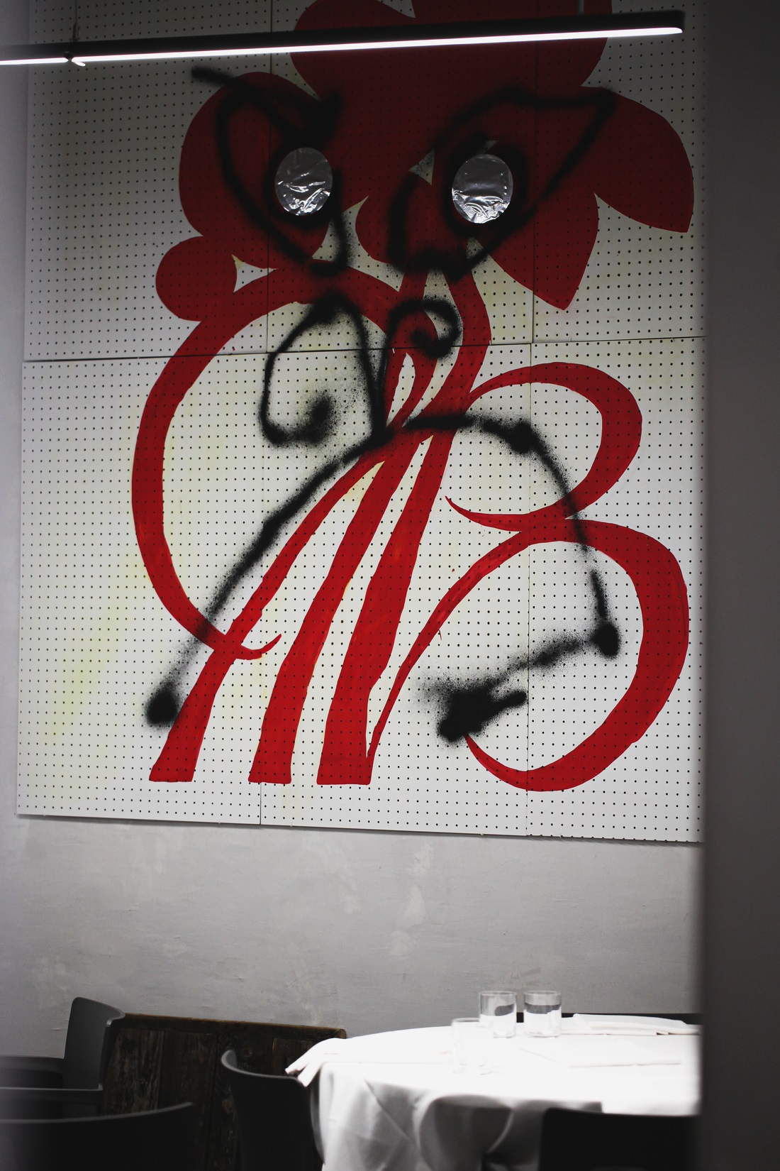 Con l’intenzione di valorizzare i giovani artisti emergenti, infatti, Zampa ha scelto di ospitare nei suoi ristoranti una serie di opere selezionate attraverso un’operazione di scouting condotta in prima persona, anche con il sostegno di gallerie stimate, come quella di Renata Fabbri a Milano. Proprio dalla galleria di via Stoppani arriva in prestito il dipinto in acrilico e matita su tela di Andrea Martinucci (Roma, classe 1991), esposto in sala da Immorale Osé. Nel locale trovano spazio anche i due pannelli fonoassorbenti decorati su commissione da Oliviero Fiorenzi, che ha scelto di ispirarsi all’estetica dei murales. Al giovane artista di Osimo (classe 1992), particolarmente sensibile alla fascinazione della street art, sono riconducibili anche le due colorate sculture in poliuretano espanso, opere apprezzate in mostra da Zampa, che ha scelto di portarle nel suo locale. Da Immorale la rosa si amplia con le opere di Andrea Q e Cristiano Rizzo. Il primo, illustratore milanese molto apprezzato, ha realizzato per l’occasione due pannelli grafici in bianco e nero; Rizzo (Borgomanero, 1993), invece, firma i teli in tessuto non tessuto dipinti. “La volontà di sostenere la giovane arte contemporanea è figlia innanzitutto di un interesse personale di lungo corso. Mi sono sempre considerato una persona eclettica, mi sono avvicinato al mondo dell’arte e dell’architettura da autodidatta, più di recente i social network mi hanno aperto gli occhi su nuove estetiche e orizzonti”. Ma sulla curiosità di Zampa per l’arte influiscono anche frequentazioni e tangenze con il mondo delle gallerie: “A Fano sono sempre stato vicino alla galleria Zucca, a Milano, oltre a Renata Fabbri, mi interfaccio con Tommaso Calabro. E poi mi informo, visito mostre, non escludo nel prossimo futuro di intraprendere collaborazioni lavorative con realtà d’arte. In vista c’è un progetto nel Montefeltro, centrato sulle residenze d’artista. Questo perché sono legato alla bellezza, oltre che alla bontà, mi interessa creare connessioni e offrire anche ai clienti dei miei ristoranti un ambiente stimolante”.