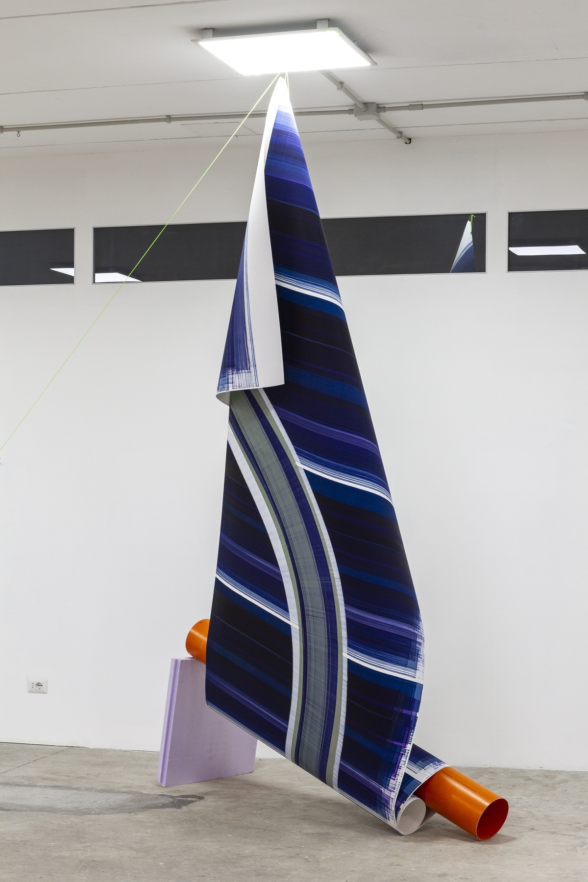 Elisabeth Sonneck (Bünde, 1962) interviene nello spazio in maniera del tutto autonoma e con determinazione. Elementi in situ, come tubi esistenti, crepe e sporgenze, vengono coinvolti nel processo creativo, dal quale nascono installazioni temporanee e site specific realizzate con lunghi rotoli di carta dipinti. Questi ultimi si adattano a innumerevoli composizioni, passando dal rigido stato cilindrico ad ampie e ariose volumetrie.