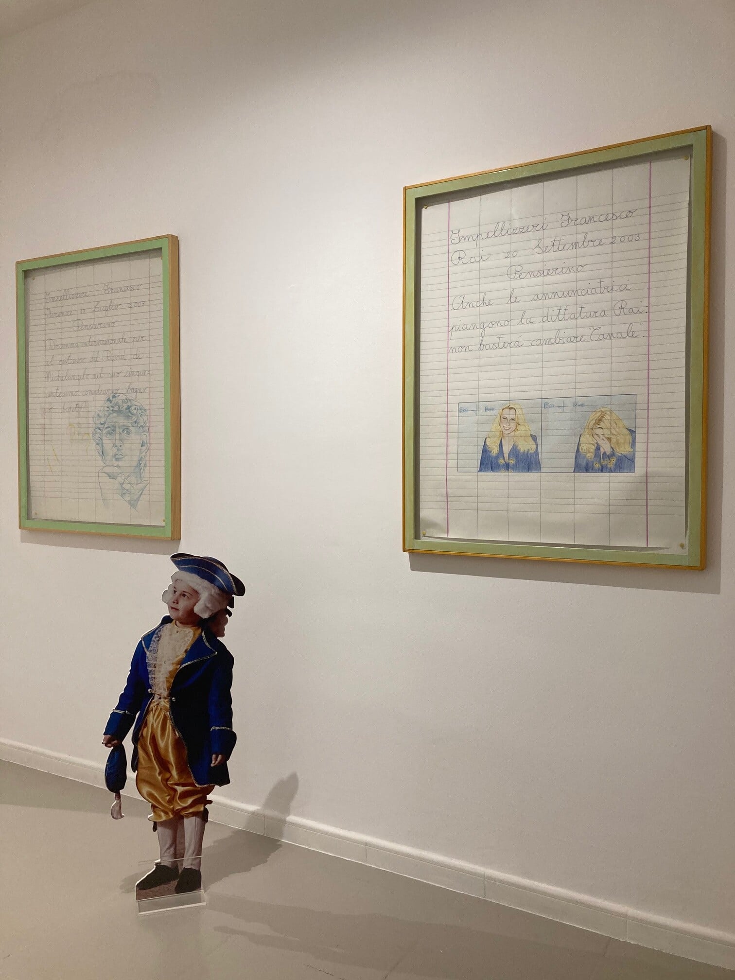Stai una favola racchiude quattro decenni di lavoro di Impellizzeri, spaziando dalla fotografia alla scrittura, dalla performance alla pittura, dalla musica al video, per una ricerca che si contraddistingue per il carattere istrionico e ironico, pur mantenendo uno sguardo lucido sulla realtà, della quale vengono messe in risalto – in maniera più faceta che seria – luci e ombre. In mostra alcuni dei personaggi inventati e performati da Impellizzeri, da Lady Muk a UNPOPOP, da ArtSaint Loop ad Angelo Candito; e poi i Pensierini, paginette di quaderni delle scuole elementari sui quali l’artista annota le sue riflessioni sul presente, fino alle opere più recenti, come Gesti Plastici, in cui parole apparentemente senza alcun legame tra loro fanno da cornice a immagini di oggetti appartenenti all’artista, per un gioco di rimandi concettuali ed estetici cui il fruitore è invitato a cimentarsi; e infine l’opera che dà il titolo alla mostra, Stai una favola, una serie di specchi sui quali è trascritta la frase che rende tutti di buon umore: “Stai una favola è una collezione di opere-specchio che ci rimandano indietro il sostegno morale di cui tutti sentiamo sempre più la necessità”, scrive Paola Nicita, “ma è anche un ironico sguardo sulla necessità di apparire senza sbavature, nell’impossibilità della défaillance, della debolezza, per una società che usa sempre più filtri per le immagini, per omologare tutti nel nome di una necessaria e imprescindibile bellezza”.