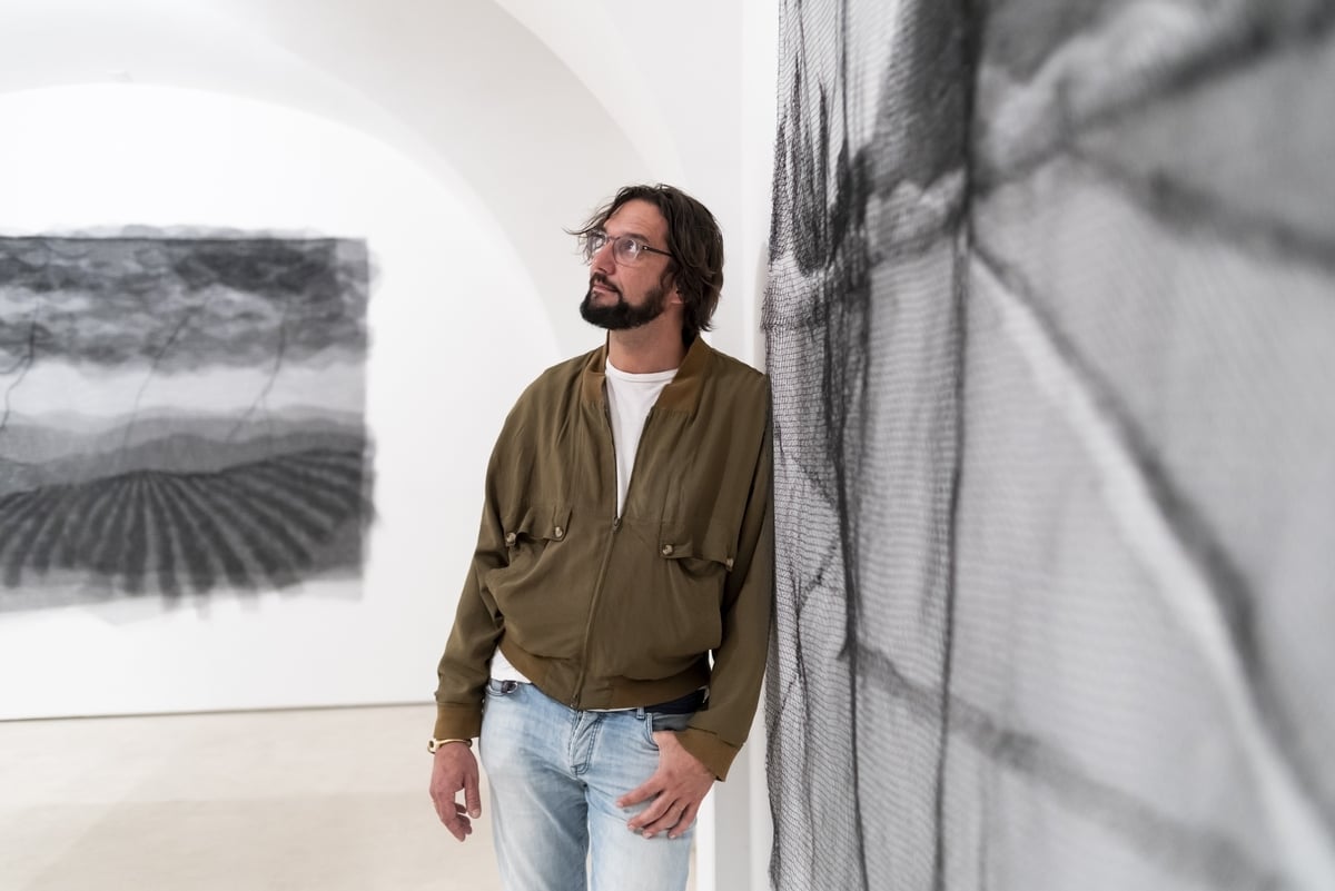 Uno dei temi principali della ricerca di Hilario Isola (Torino, 1976) è il rapporto tra l’uomo e l’agricoltura, con una particolare attenzione all’equilibrio con l’ambiente attraverso l’utilizzo di tecniche tradizionali come l’apicoltura e la vinificazione. Per Rurale, la sua ultima malla galleria Valentina Bonomo a Roma, l’artista ha presentato una serie di lavori nuovi, concepiti come tappe di un’esplorazione della campagna italiana contemporanea. Immagini eseguite con una tecnica particolare, basata sulla cucitura e la sovrapposizione di reti agricole utilizzate per proteggere le piantagioni dalla grandine, dai raggi ultravioletti e dagli uccelli, cucite a mano in modo da provocare interessanti giochi di luci e ombre. Una sorta di tessitura a maglie di larghezze diverse, che a livello visivo ricorda la tecnica dell’acquaforte, utilizzata di frequente per le illustrazioni dei libri di botanica, come a voler suggerire una dimensione simbolica e quasi ottocentesca dell’esposizione.